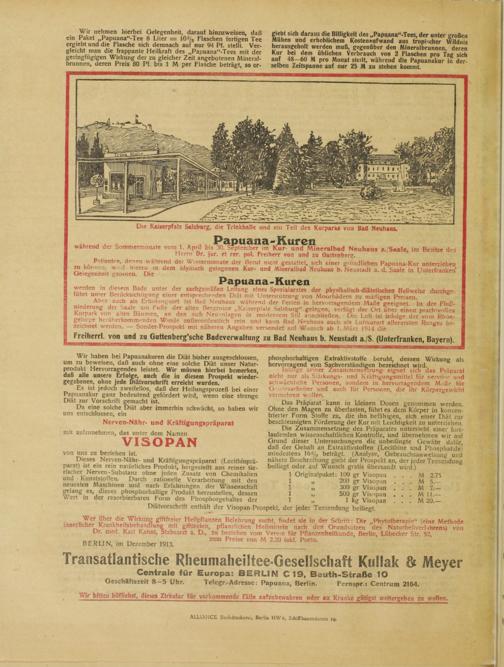 Wir nehmen hierbei Gelegenheit, darauf hinzuweisen, daß ein Paket „Papuana“-Tee 8 Liter — 10 z / 3 Flaschen fertigen Tee ergiebt und die Flasche sich demnach auf nur 94 Pf. stellt. Vergleicht man die frappante Heilkraft des „Papuana“-Tees mit der geringfügigen Wirkung der zu gleicher Zeit angebotenen Mineralbrunnen, deren Preis 80 Pf. bis 1 M per Flasche beträgt, so er