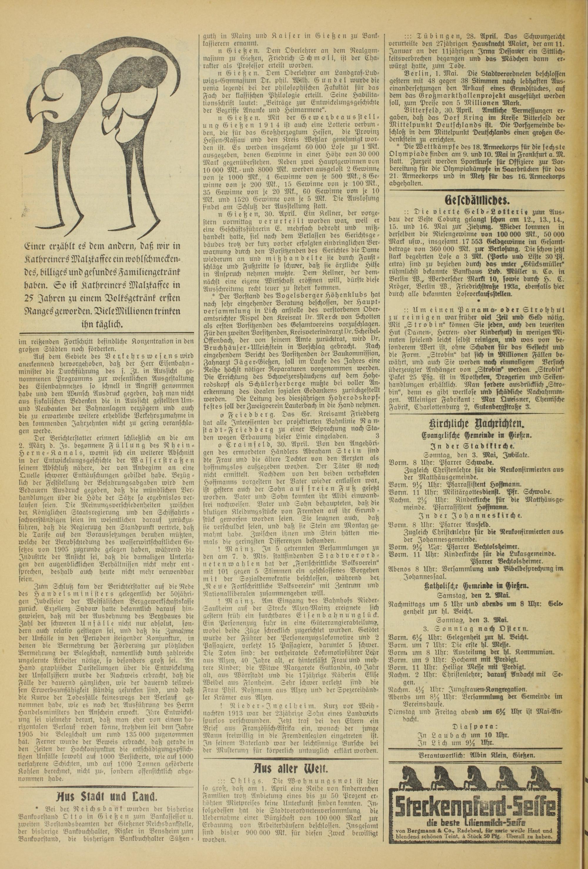 * Die Wettkämpfe des 18. Armeekorps für die sechste Olympiade finden am 9. und 10. Mai in Frankfurt a. M. statt. Zurzeit werden Sportkurse für Offiziere zur Vorbereitung für die Olympiakämpfe in Saarbrücken für das 21. Armeekorps und in Metz für das 16. Armeekorps abgehalten.