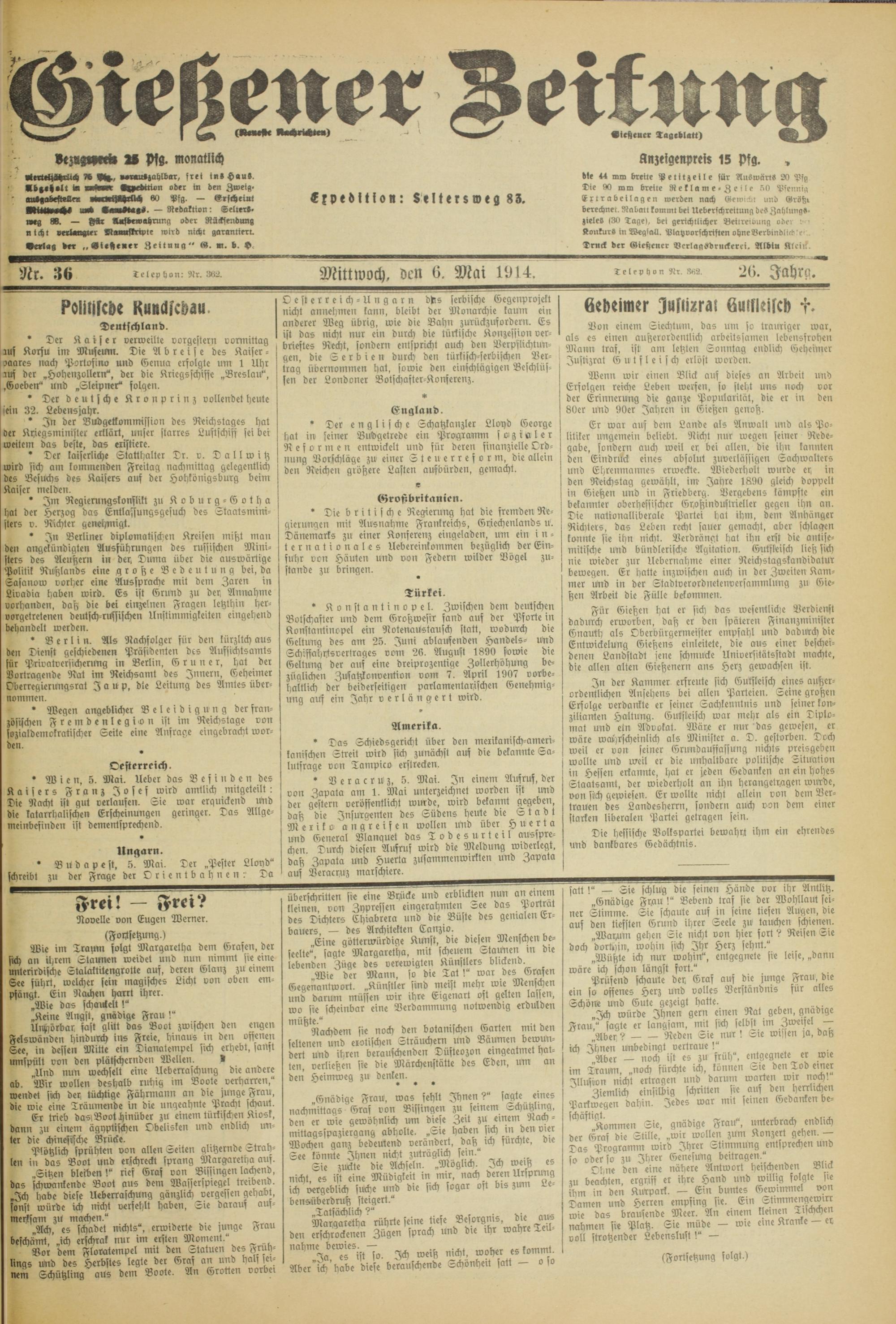 ytt. 36 _ Telephon: Nr. 382. Mittwoch, dcn 0. Mai 1014.