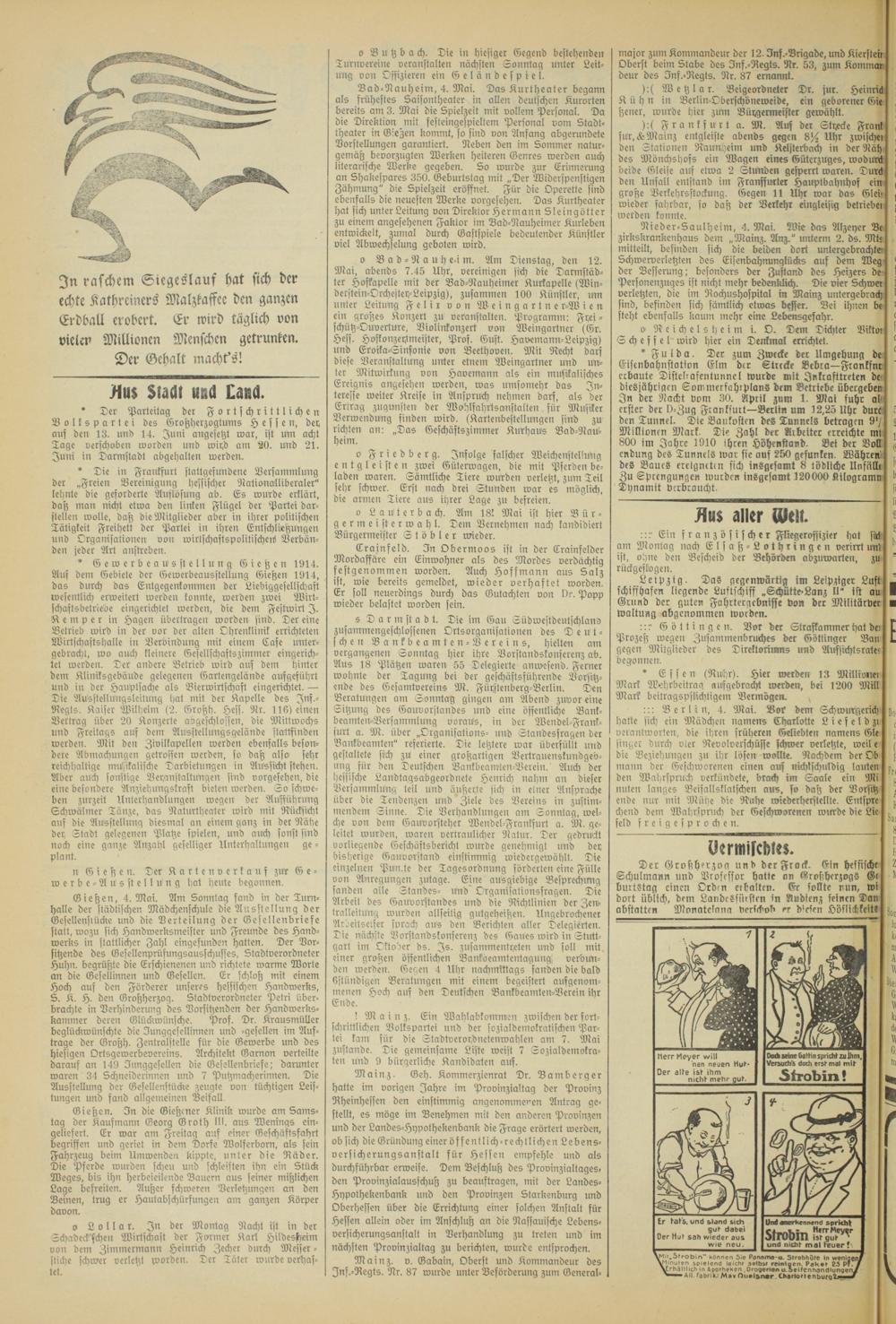 o Friedberg. Infolge falscher Weichenstellung entgleisten zwei Güterwagen, die mit Pserden beladen waren. Sämtliche Tiere wurden verletzt, zum Teil sehr schwer. Erst nach drei Stünden war es möglich, die armen Tiere aus ihrer Lage zu befreien.