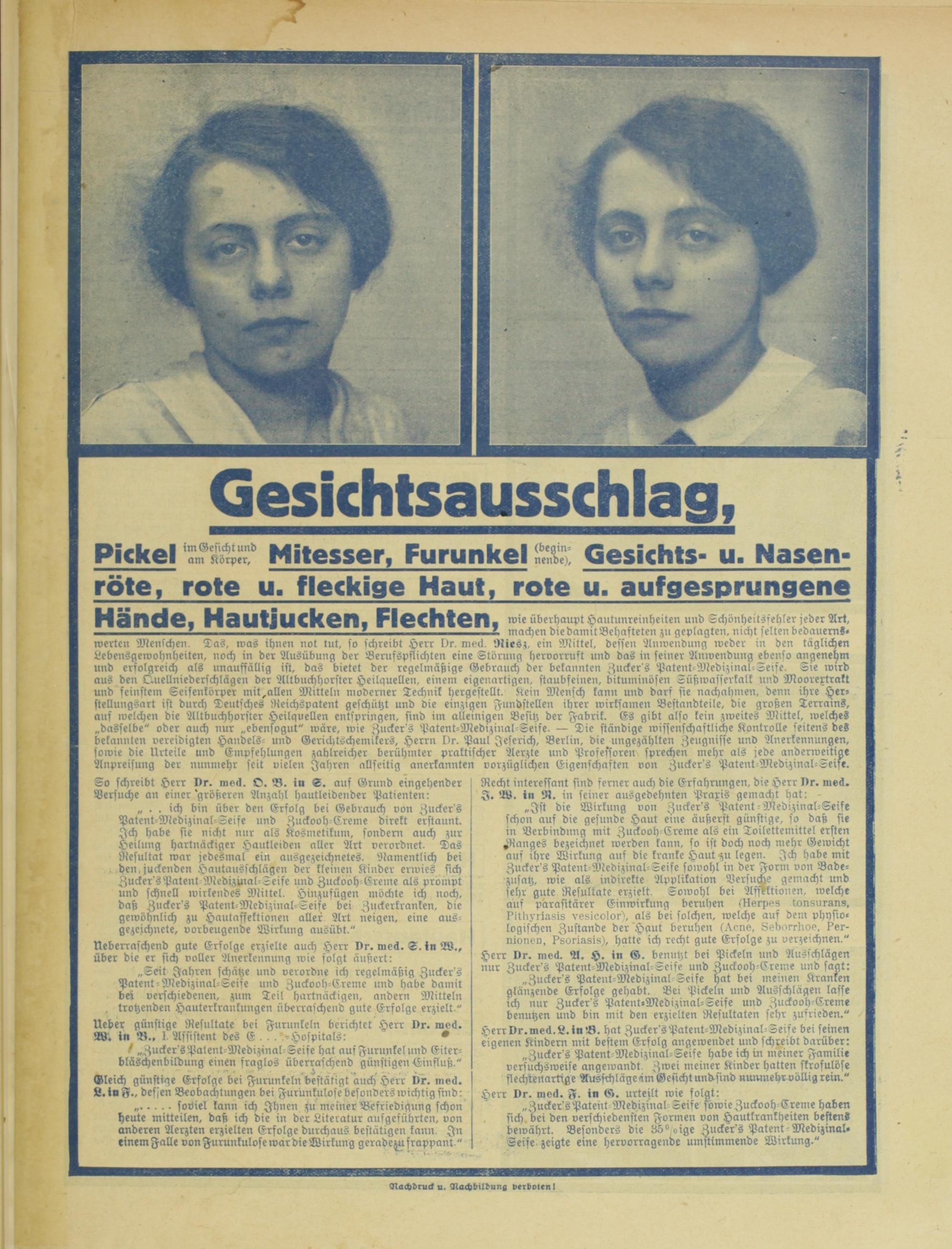 „Zucker's Patent-Medizinal-Seife söwieZuckooh-Creme haben sich bei den verfchiedensten Formen von Hautkrankheiten bestens bewährt, Befonders die libPoige Zucker's Patent-Medizinal- Seife zeigte eine hervorragende umstimmende Wirkung."