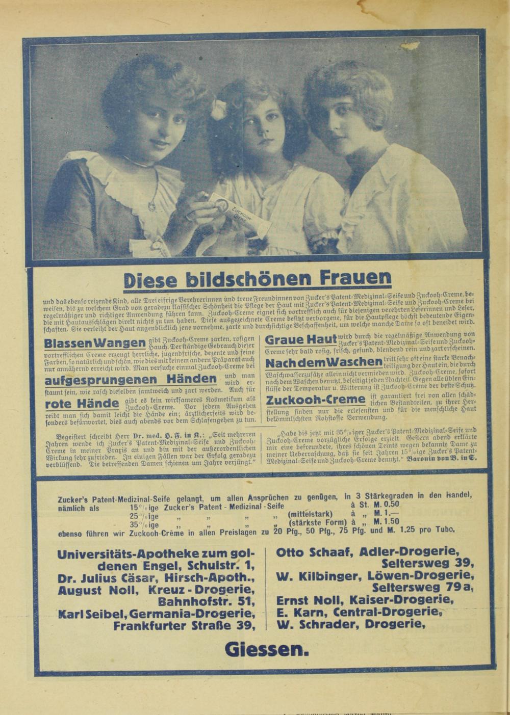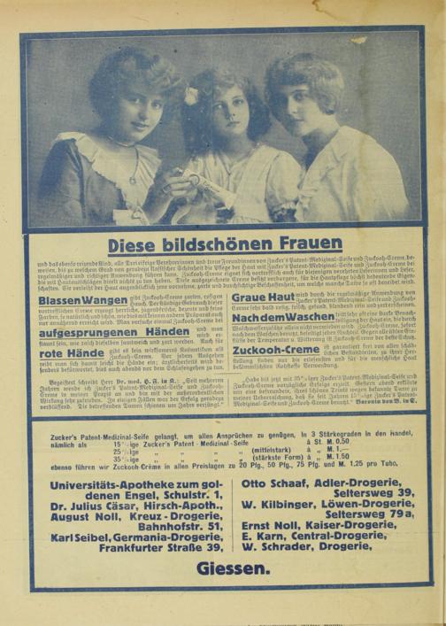 Universitäts-Apotheke zum goldenen Engel, Schulstr. 1, Dr. Julius Cäsar, Hirsch-Apoth., August Noll, Kreuz - Drogerie, Bahnhofstr. 51, Karl Seibel, Germania-Drogerie, Frankfurter Straße 39,