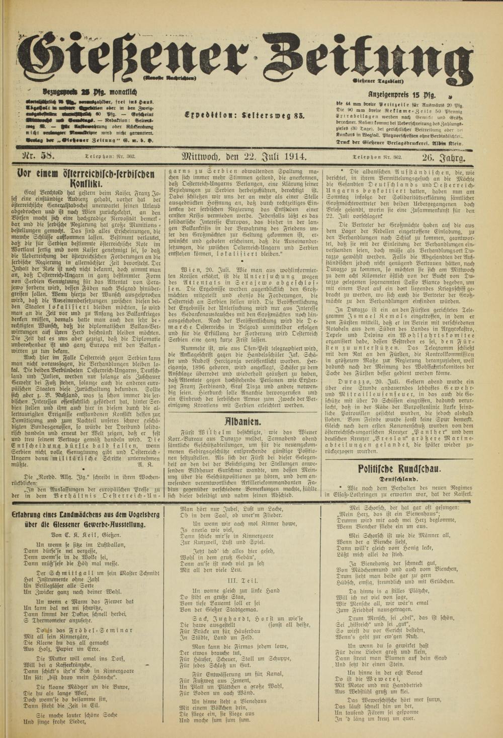 Auch hier im Falle Oesterreich gegen Serbien kann man nicht Voraussagen, die Verhandlungen bleiben lokal. Die beiden Verbündeten Oesterreich-Ungarns, Deutschland und Italien, werden nur solange als Zuschauer Gewehr bei Futz stehen, solange auch die anderen europäischen Staaten diese Zurückhaltung bekunden. Sollte sich aber z. B. Rußland, was ja schon immer die serbischen Interessen offensichtlich gefördert hat, hinter Serbien stellen und ihm auch hier in diesem durch die al- lertraurigstcn Ereigniffe entstandenen Konflikt helfen zur Demütigung und zum Nachteil unseres schwer geschädigten Bundesgenossen, so würde der Dreibund solidarisch handeln und erneut der Welt zeigen, datz er fest und treu seinem Vertrage gemätz handeln wird. D i e Entscheidung dürfte bald fallen, wenn Serbien nicht volle Genugtuung gibt und Oesterreich - Ungarn dann militärische Schritte unternehmen mühte. A. K.