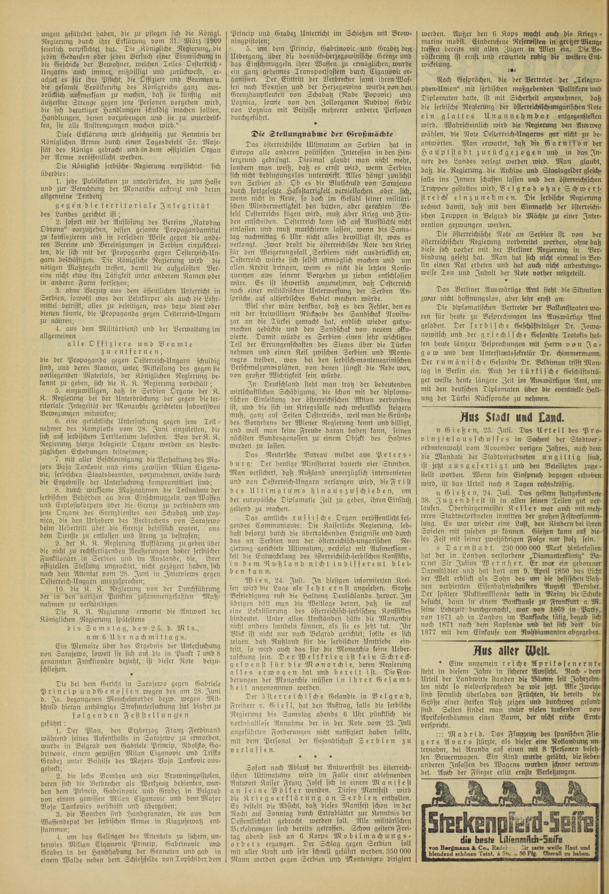Das österreichische Ultimatum an Serbien hat in Europa alle anderen politischen Interessen in den Hintergrund gedrängt. Diesmal glaubt man nicht mehr, sondern man weih, daß es ernst wird, wenn Serbien sich nicht bedingungslos unterwirft. Alles hängt zunächst von Serbien ab. Ob es die Blutschuld von Sarajewo durch fortgesetzte Haksstarrigkeft vervielfachen oder sich, wenn nicht in ReUe, so doch im Gefühl seiner militärischen Minderwertigkeit den haften, aber gerechten Befehl Oesterreichs ftigen wird, muß über Krieg und Frieden entscheiden. Oesterreich kann sich aus Ausflüchte nicht einlassen und muh marschieren lassen, wenn bis Samstag nachmittag 6 Uhr nicht alles bewilligt ist, was es verlangt. Zwar droht die österreichische Note den Kfteg für den Weigerungsfall.Serbiens nicht ausdrücklich an, Oesterreich würde sich selbst unmöglich machen uNd um allen Kredit dftngen, wenn es nicht die letzten Konsequenzen aus seinem Vorgehen zu ziehen entschlossen wäre. Es ist schwerlich anzunehmen, daß Oesterreich nach einer militärischen Unterwerfung der Serben Ansprüche auf allserbisches Gebiet machen würde.