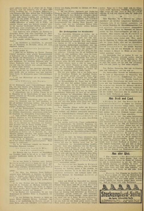 Das Reutersche Bureau meldet aus Petersburg: Der heutige Ministerrat dauerte vier Stunden. Man versichert, daß Rußland unverzüglich intervenieren und von Oesterreich-Ungarn verlangen wird, die F r i st des Ultimatums h i n a u s z u s ch i e b e n, um der europäische Diplomatie Zeit zu geben, ihren Einfluß geltend zu machen.