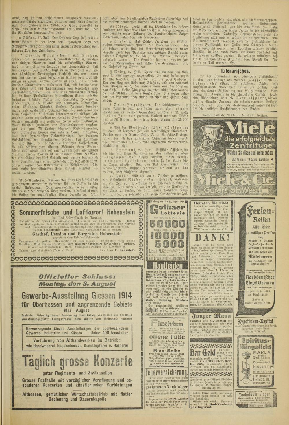 Vad-Rauheim. Am Samstag ist es hier sehr lebhaft zugegangen, namentlich befanden sich die Russen in sehr großer Aufregung. Das gegenwärtig wenig günstige Wetter und der drohende Krieg werden, so befürchtet man, die Saison im ungünstigsten Sinne beeinflussen. Man