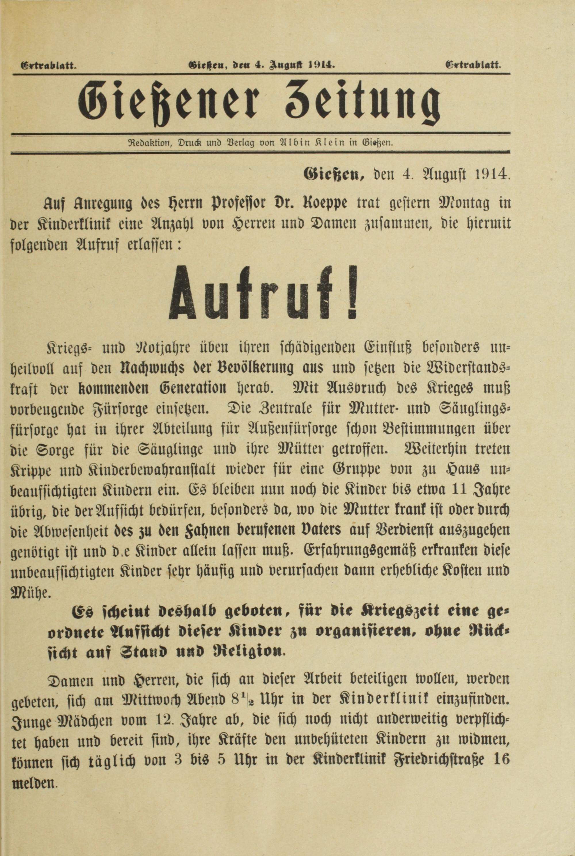 Aus Anregung der Herrn Professor Dr. Noeppe trat gestern Montag in der Kinderklinik eine Anzahl von Herren und Damen zusammen, die hiermit folgenden Ausruf erlassen: