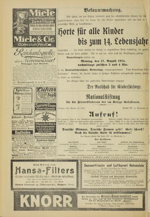 Ein gewaltiger Krieg ist über Deutschland hereingebrochen. — Millionen deutscher Männer bieten ihre Brust den Feinde dar. — Biele von ihnen werden nicht zurüärkrehren. — Unsere Pflicht ist es, für die Hinterbliebenen dei Tapferen zu sorgen. - Des Staates Aufgabe ist, hier zu helfen, aber er kann es nicht allein, diese Hilfe inug