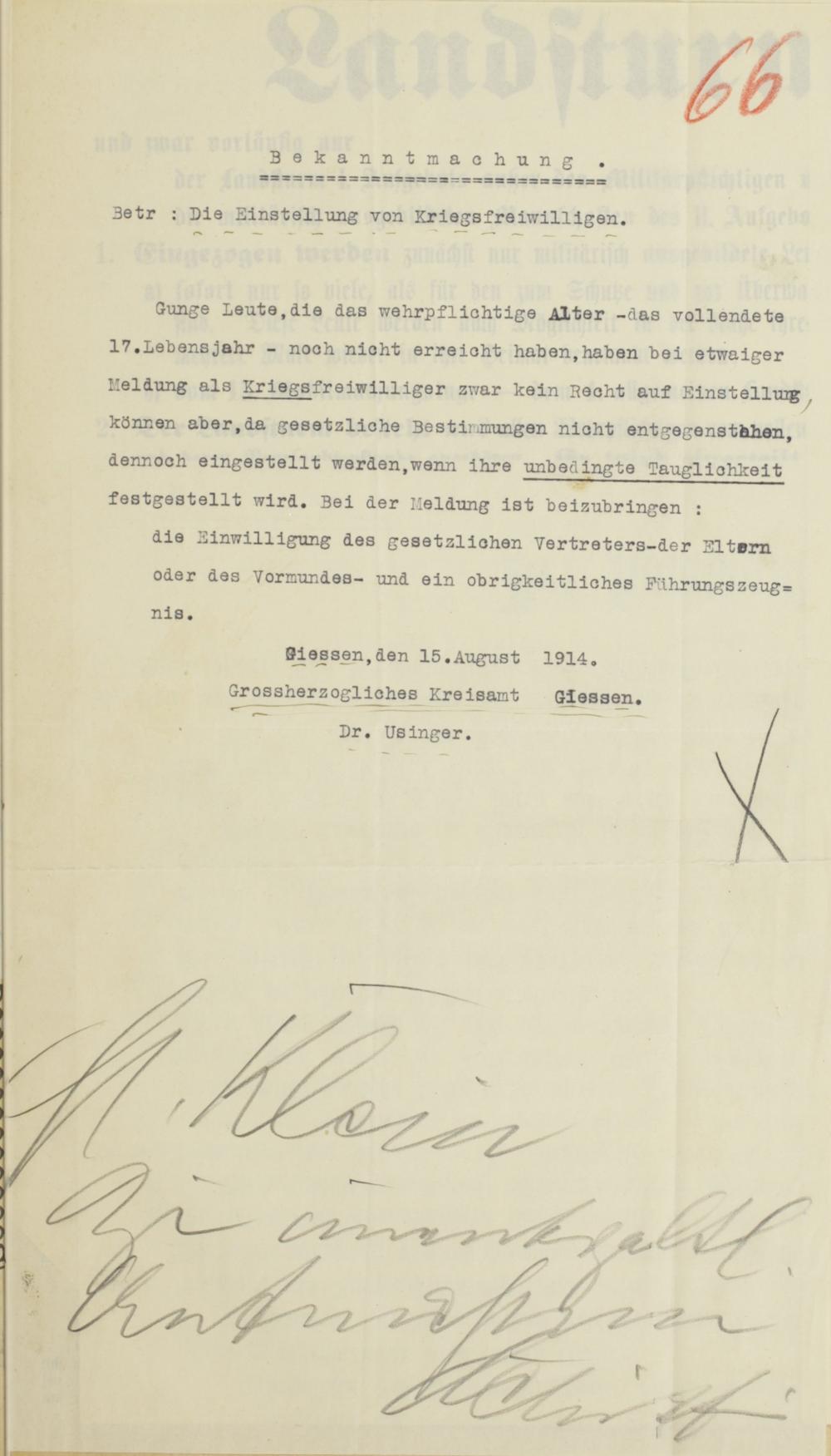 Gunge Leute,die das wehrpflichtige Alter -das vollendete 17.Lebensjahr - noch nicht erreicht haben,haben bei etwaiger Meldung als Kriegs freiwilliger zwar kein Recht auf Einstelluig . können aber,da gesetzliche Bestimmungen nicht entgegensthhen, dennoch eingestellt werden,wenn ihre unbedingte Tauglichkeit festgestellt wird. Bei der Meldung ist beizubringen :