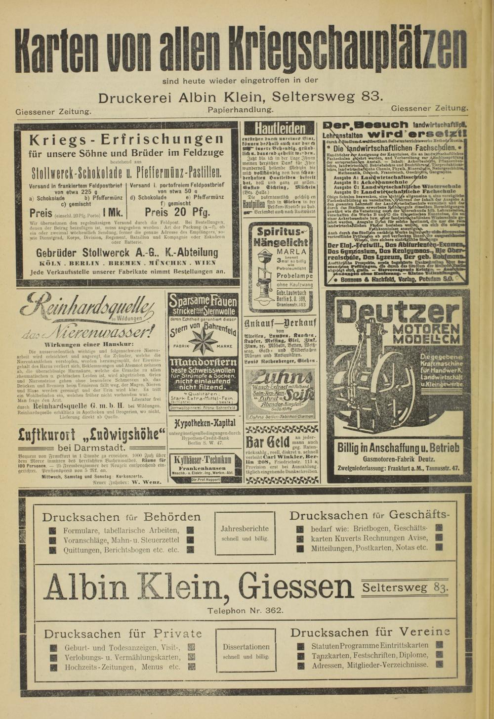 Wir übernehmen den regelmässigen Versand durch die Feldpost. Bei Bestellungen, denen der Betrag beizufügen ist. muss angegeben werden: Art der Packung (a —f), ob ein oder zweimal wöchentlich Sendung, ferner die genaue Adresse des Empfängers, sowie Dienstgrad, Korps, Division, Regiment, Bataillon und Kompagnie oder Eskadron