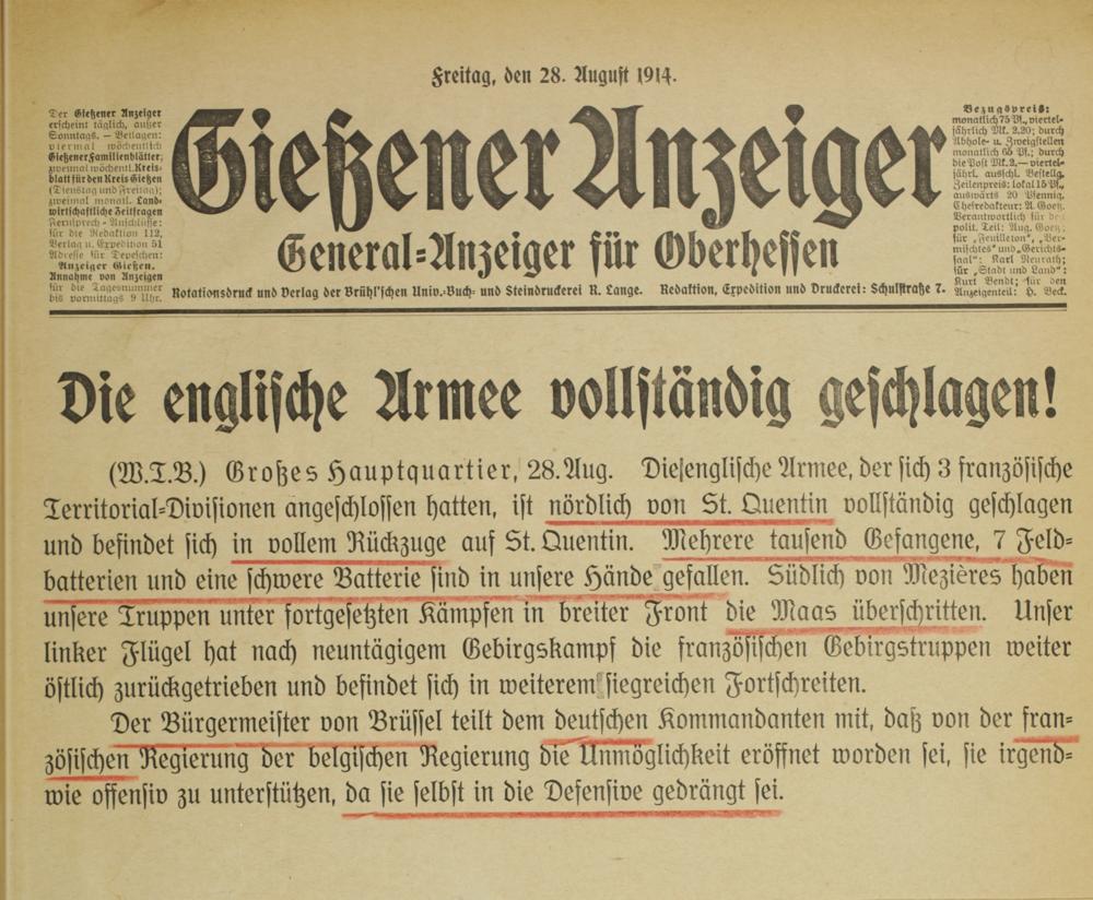(W.T.B.) Großes Hauptquartier. 28.Aug. Diejenglische Armee, der sich 3 französische Territorial-Divisionen angeschlossen hatten, ist nörd lich von St. Quentin vollständig geschlagen und befindet sich in vollem Rückzuge aus St. Quentin. Mehrere tausend Gefangene. 7 Feld-