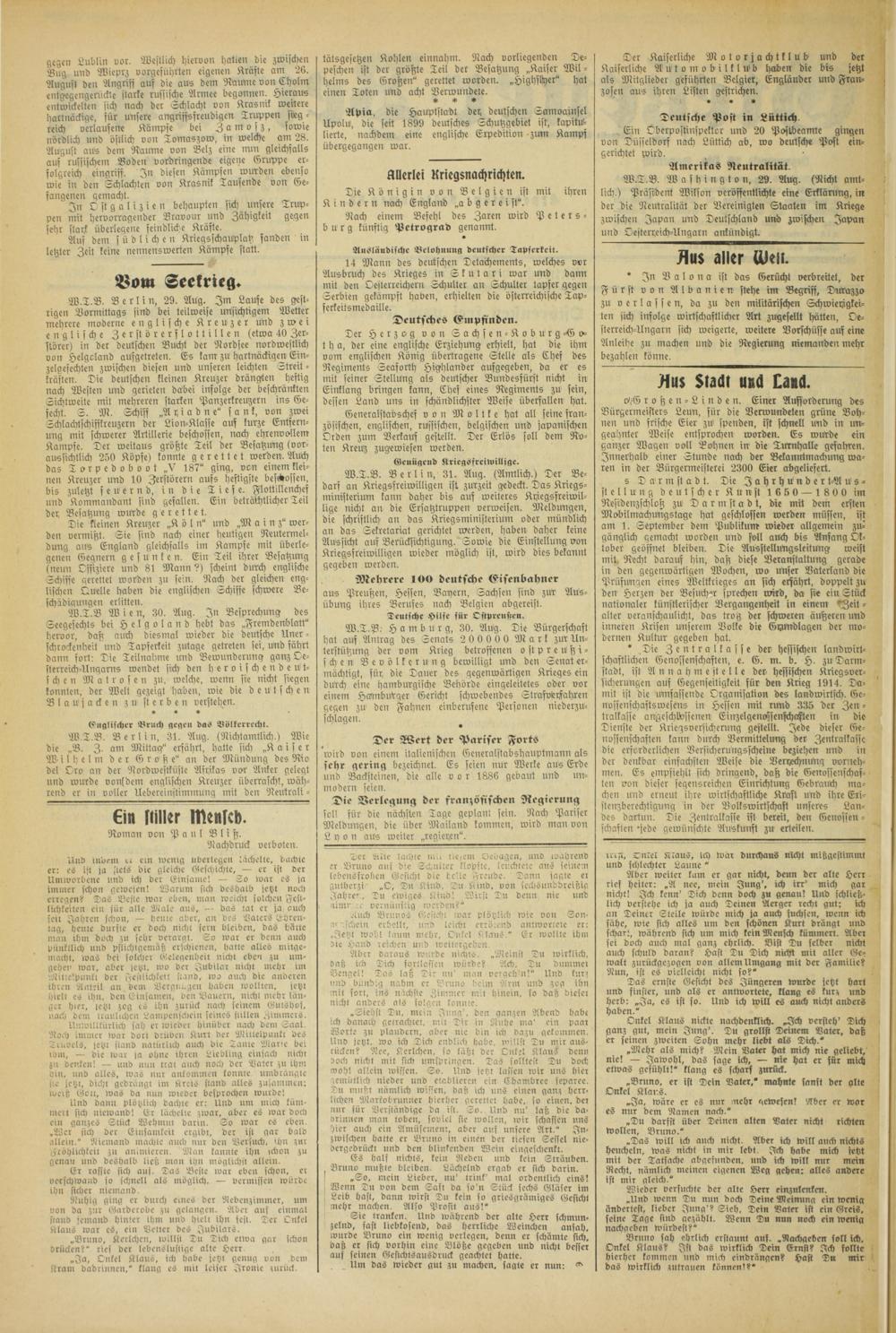 W.T.B. Berlin, 29. Aug. Im Laufe des gestrigen Vormittags sind bei teilweise unsichtigem Weiter mehrere moderne englische Kreuzer und zwei englische Zerstörerslottillen (etwa 40 Zerstörer) in der deutschen Bucht der Nordsee nordwestlich von Helgoland ausgetreten. Es kam zu hartnäckigen Ein- zelgesechten zwischen diesen und unseren leichten Streit - krästen. Die deutschen kleinen Kreuzer drängten heftig nach Westen und gerieten dabei infolge der beschränkten Sichtweite mit mehreren starken Panzerkreuzern ins Gefecht. S. M. Schiff „A g i a d n e" sank, von zwei Schlachtschiffkreuzern der Lion-Klasse auf kurze Enffern- ung mit schwerer Artillerie beschossen, nach ehrenvollem Kampfe. Der weitaus größte Teil der Besatzung (voraussichtlich 250 Köpfe) konnte gerettet werden. Auch das Torpedoboot „V 187" ging, von einem kleinen Kreuzer und 10 Zerstörern aufs heftigste beschossen, bis zuletzt feuernd, in die Tiefe. Flottillenchef und Kommandant sind gefallen. Ein beträchtlicher Teil der Besatzung wurde gerettet.