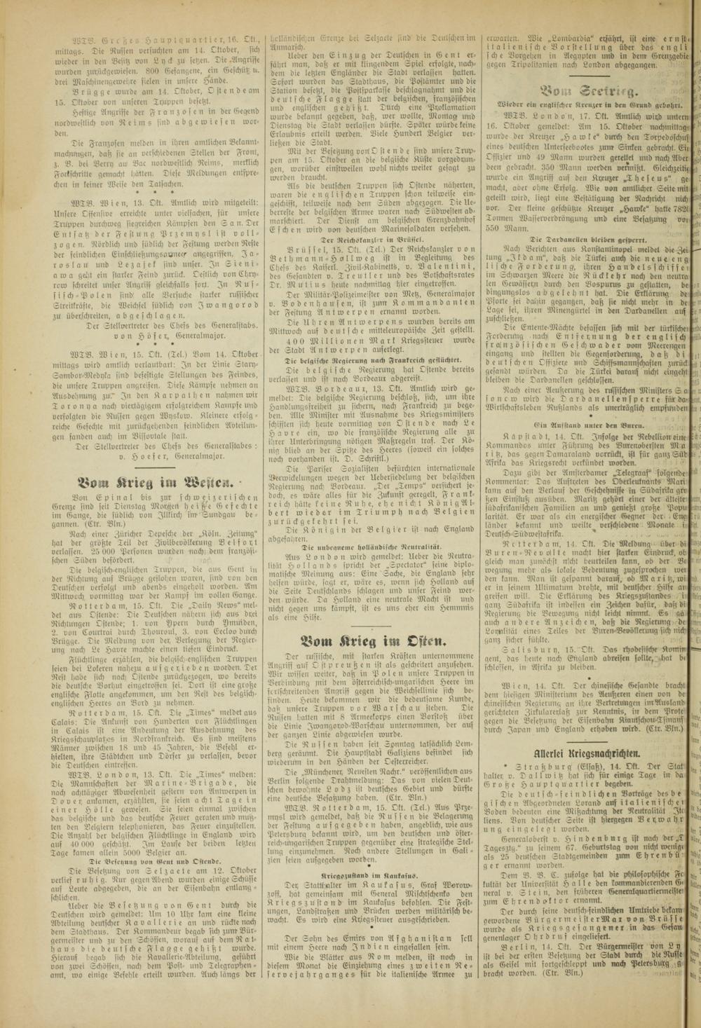 Flüchtlinge erzählen, die belgisch-englischen Truppen seien bei Lokeren nahezu a u s g e r, i e b e n worden. Der Rest habe sich nach Ostende zurückgezogen, wo bereits die deutsche Vorhut eingetrofsen sei. Dort ist eine große englische Flotte angekommen, um den Rest des belgischenglischen Heeres an Bord zu nehmen.