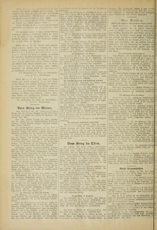 -lieber die Besetzung von Gent duich die Deutschen wird gemeldet: Um 10 Uhr kam eine kleine Abteilung deutscher Kavallerie an und rückte nach dem Stadthaus. Der Kommandeur begab sich zum Bürgermeister und zu den Schöffen, worauf auf dem Rathaus die deutsche Flagge gehißt wurde. Hierauf begab sich die Kavallerie-Abteilung, geführt von zwei Schöffen, nach dem Post- und Telegraphen - amt, wo einige Befehle erteilt wurden. Auch längs der