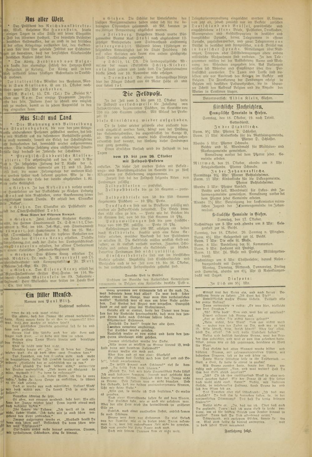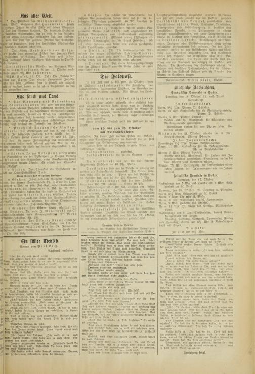 Mittwoch, den 21. Oktober, abends um 8 Uhr: Kriegsbetstunde. Psarrer Schwabe.
