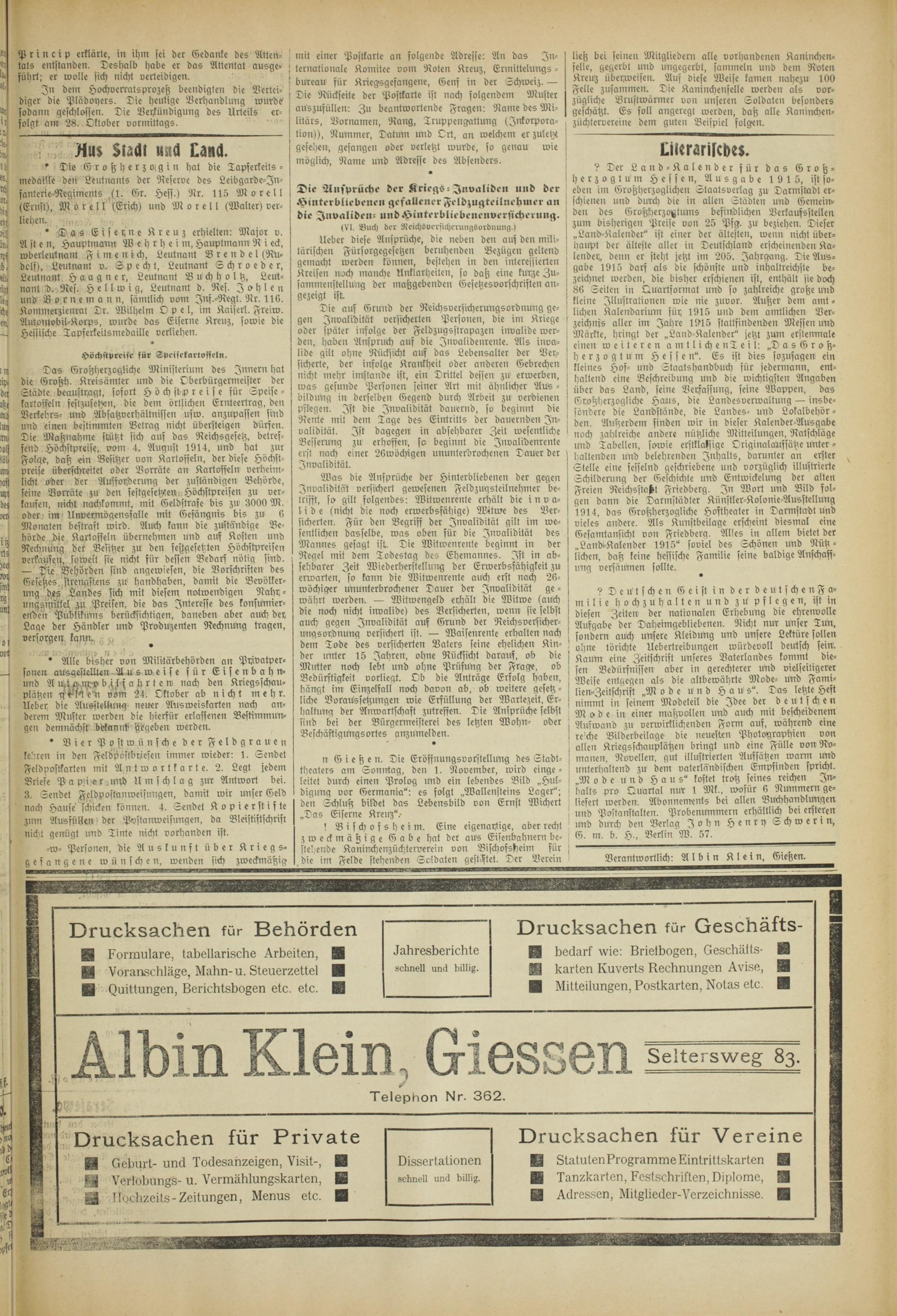 * D a s Eiserne Kreuz erhielten: Major v. A st e n, Hauptmann W e h r h e i m, Hauptmann R i eck, wberleutnant Fimenich, Leutnant B r e n d e l (Rü° dcls), Leutnant v. Specht, Leutnant Schroeder, Leutnant H a a g n e r, Leutnant B u ch h o l tz, Leutnant d. Res. H e l l w i g, Leutnant d. Res. Johlen und Bornemann, sämtlich vom Jns.-Regt. Nr. 116. Kommerzienral Dr. Wilhelm Opel, im Kaiser!. Freiw. Automobil-Korps, wurde das Eiserne Kreuz, sowie die Hessische Tapserkeitsmedaille verliehen.