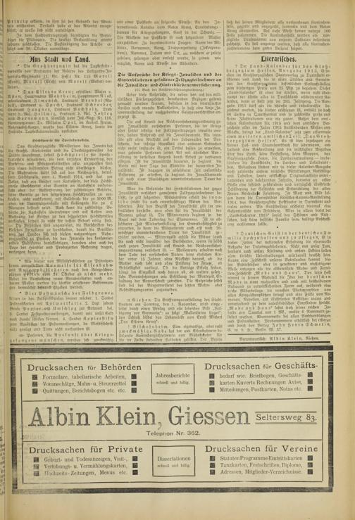? Der Land-Kalender für das Groß- Herzogtum Hessen, Ausgabe 1915, ist soeben im Grotzherzoglichen Staatsverlag zu Darmstadt erschienen und durch die in allen Städten und Gemeinden des Grohhcrzo^tums befindlichen Verkaufsstellen zum bisherigen Preise von 25 Psg. zu beziehen. Dieser „Land-Kalender" ist einer der ältesten, wenn nicht überhaupt der älteste aller in Deutschland erscheinenden Kalender, denn er steht jetzt im 205. Jahrgang. Die Ausgabe 1915 darf als die schönste und inhaltreichste bezeichnet werden, die bisher erschienen ist, enthält sie doch 86 Seiten in Quartformat und so zahlreiche große und kleine Illustrationen wie nie zuvor. Außer dem amtlichen Kalendarium für 1915 und dem amtlichen Verzeichnis aller im Jahre 1915 stattfindenden Messen und Märkte, hringt der „Land-Kalender" jetzt zum erstenmale einen weiteren a m t l i ch e nT e i l: „D a s G r o h- herzogtum Hesse n". Es ist dies sozusagen ein kleines Hof- und Staatshandbuch für jedermann, enthaltend eine Beschreibung und die wichtigsten Angaben über das Land, seine Verfassung, seine Wappen, das Erohherzogliche Haus, die Landesverwaltung — insbesondere die Landstünde, die Landes- und Lokalbehörden. Außerdem finden wir in dieser Kalender-AuSgabe noch zahlreiche andere nützliche Mitteilungen, Ratschläge und Tabellen, sowie erstklassige Originalaufsätze unter - haltenden uüd belehrenden Inhalts, darunter an erster Stelle eine fesselnd geschriebene und vorzüglich illustrierte Schilderung der Geschichte und Entwickelung der alten Freien Reichsstahl Friedberg. In Wort und Bild folgen dann die Darmstädter Künstler-Kolonie-AusstelluNg 1914, das Erohherzogliche Hoftheater in Darmstadt und vieles andere. Als Kunstbeilage erscheint diesmal eine Gesamtansicht von Friedberg. Alles in allem bietet der „Landl-Kalender 1915" soviel des Schönen und Nütz - lichen, dah kein« hessische Familie seine baldige Anschaffung versäumen sollte.