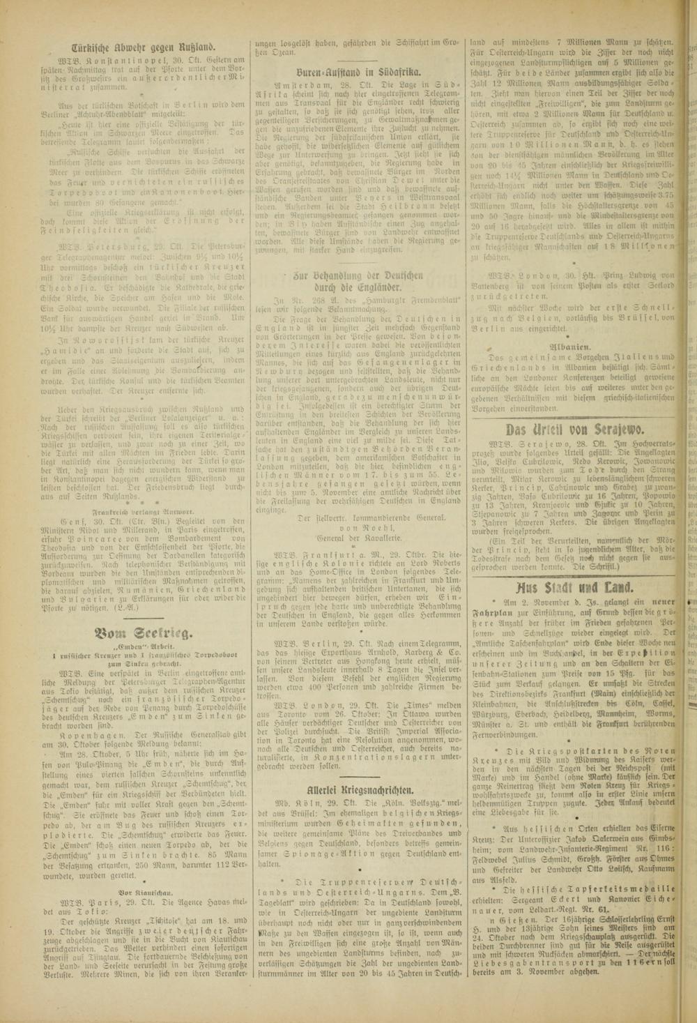 WTB. Frankfurt a. M., 29. Oktbr. Die hiesige englische Kolonie richtete an Lord Roberts und an das Home-Office in London folgendes Telegramm: „Namens der zahlreichen in Frankfurt und Umgebung sich aufhaltenden britischen Untertanen, die sich ungehindert hier bewegen dürfen, erheben wir Einspruch gegen jede harte und unberechtigte Behandlung der Deutschen in England, die gegen alles Herkommen in unserem Lande verstoßen würde.