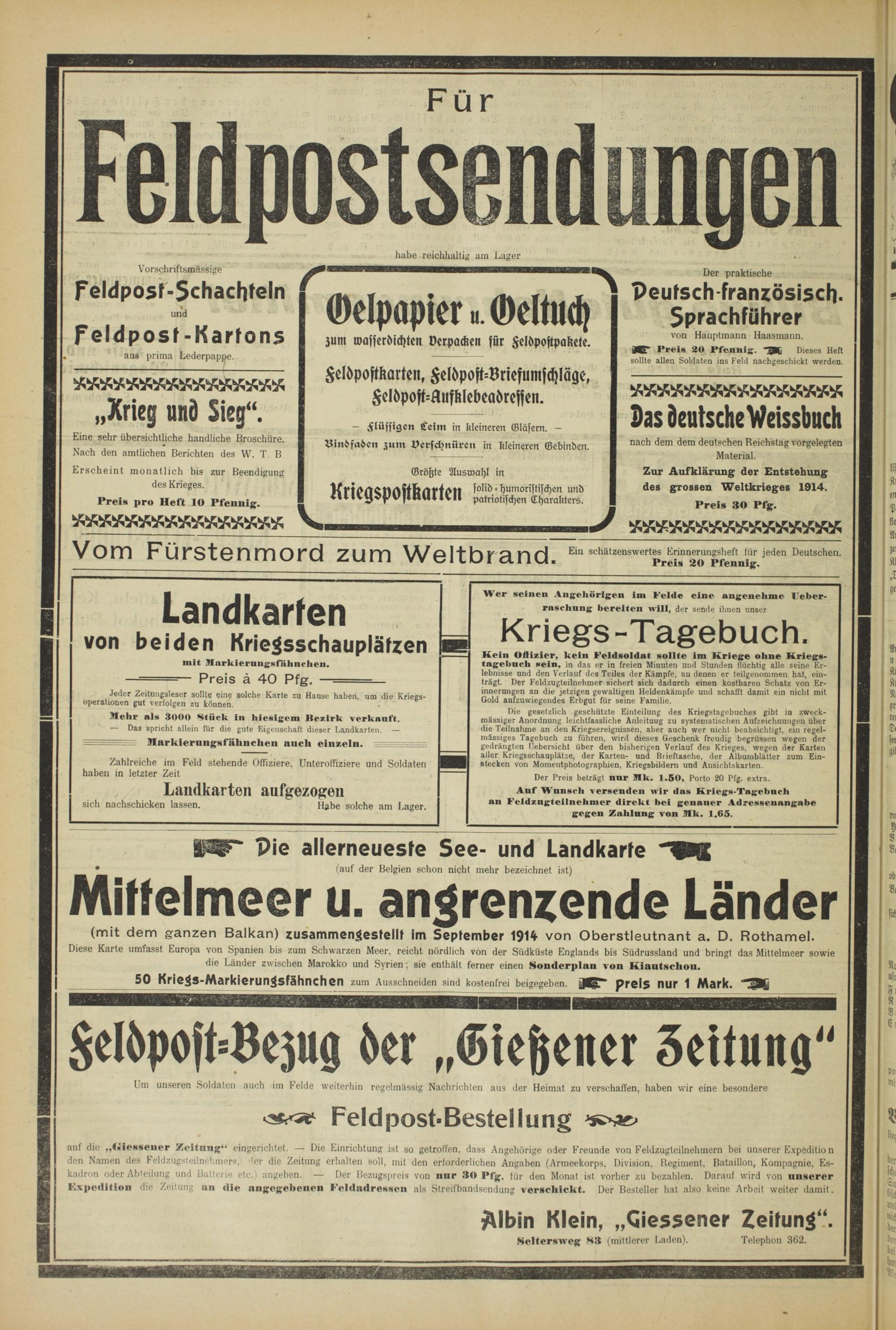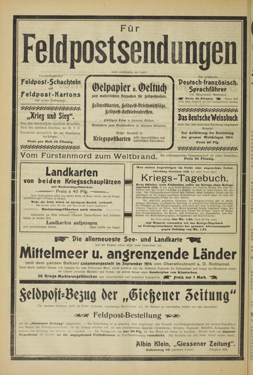 auf die „tiiessener Zeitung 4 - eingerichtet. — Die Einrichtung ist so getroffen, dass Angehörige oder Freunde von Feldzugteilnehmern bei unserer Expeditio n den Namen des Feldzugsteilnehmers. -'er die Zeitung erhalten soll, mit den erforderlichen Angaben (Armeekorps, Division, Regiment, Bataillon, Kompagnie, Eskadron oder Abteilung und Batterie etc.) angeben. — Der Bezugspreis von nur 30 Pfg. für den Monat ist vorher zu bezahlen. Darauf wird von unserer Expedition die Zeitung an die angegebenen Feldadressen als Streifbandsendung verschickt. Der Besteller hat also keine Arbeit weiter damit.
