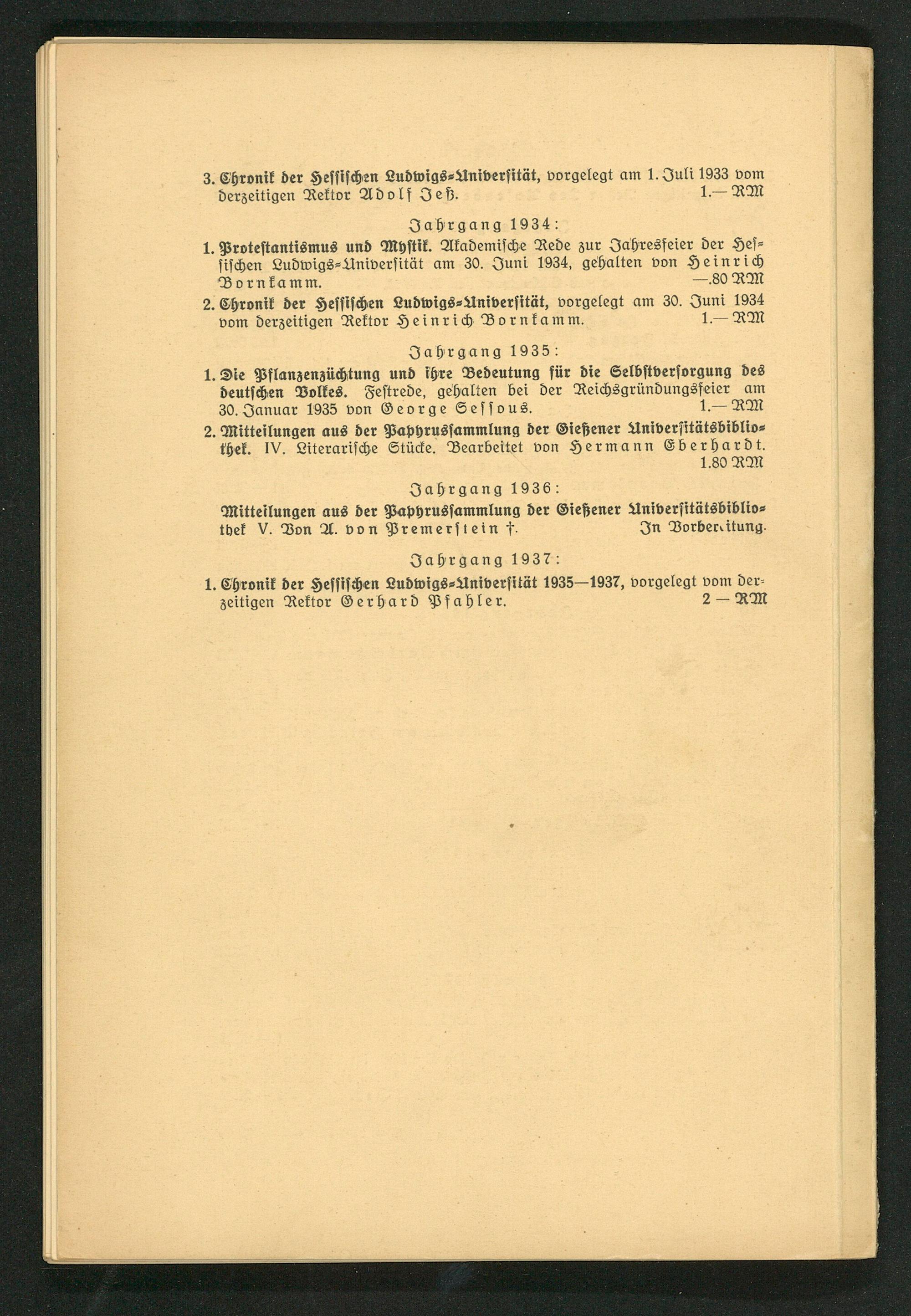 3. Chronik der Hessischen Ludwigs⸗Aniversität, vorgelegt am 1. Juli 1933 vom derzeitigen Rektor Adolf Jeß. 1. RM