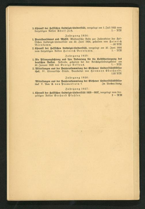 1. Chronik der Hessischen Ludwigs⸗Aniversität 1935— 1937, vorgelegt vom der⸗ zeitigen Rektor Gerhard Pfahler. 2 RM