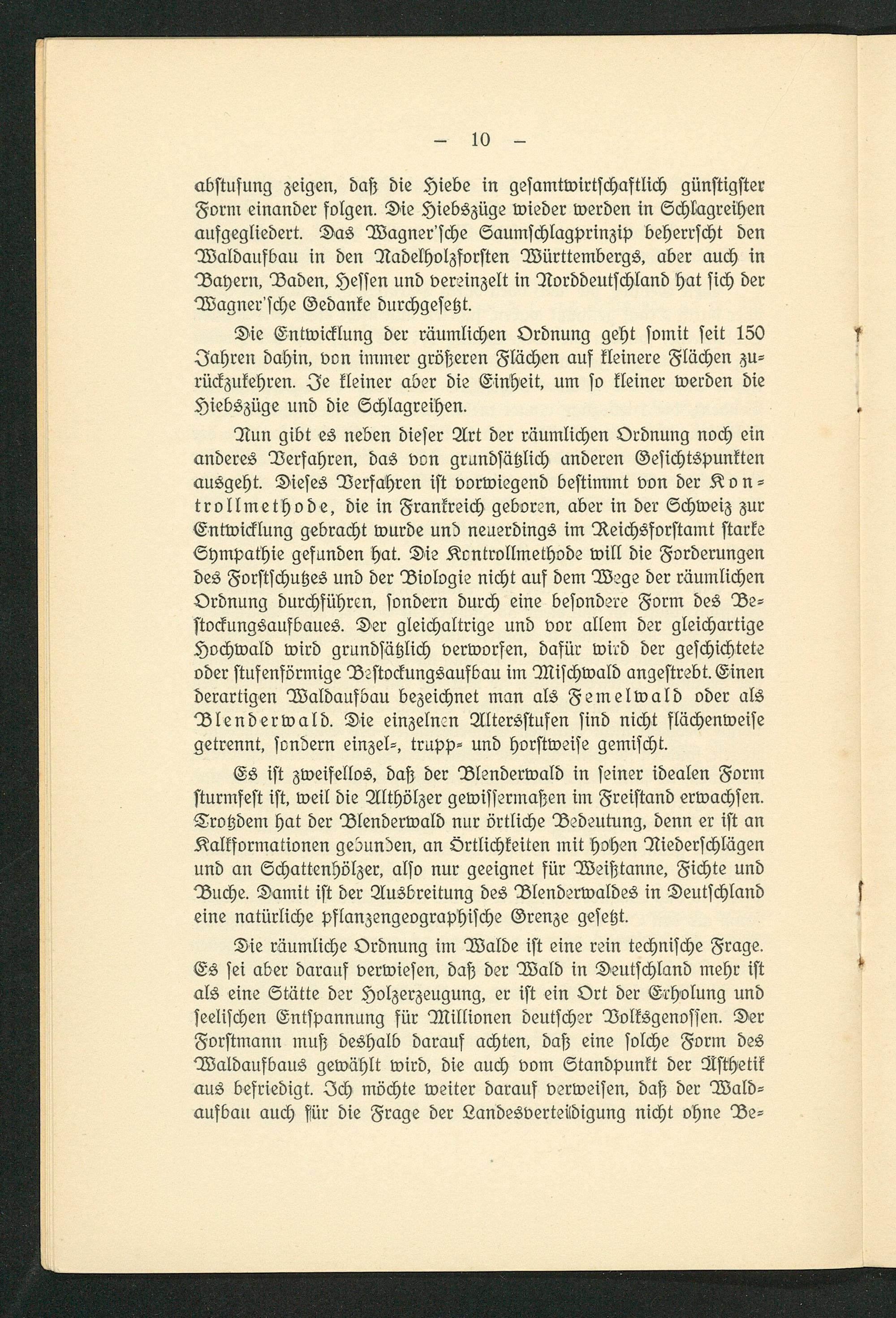 abstufung zeigen, daß die Hiebe in gesamtwirtschaftlich günstigster Form einander folgen. Die Hiebszüge wieder werden in Schlagreihen aufgegliedert. Das Wagner'sche Saumschlagprinzip beherrscht den Waldaufbau in den Nadelholzforsten Württembergs, aber auch in Bayern, Baden, Hessen und vereinzelt in Norddeutschland hat sich der Wagner'sche Gedanke durchgesetzt.