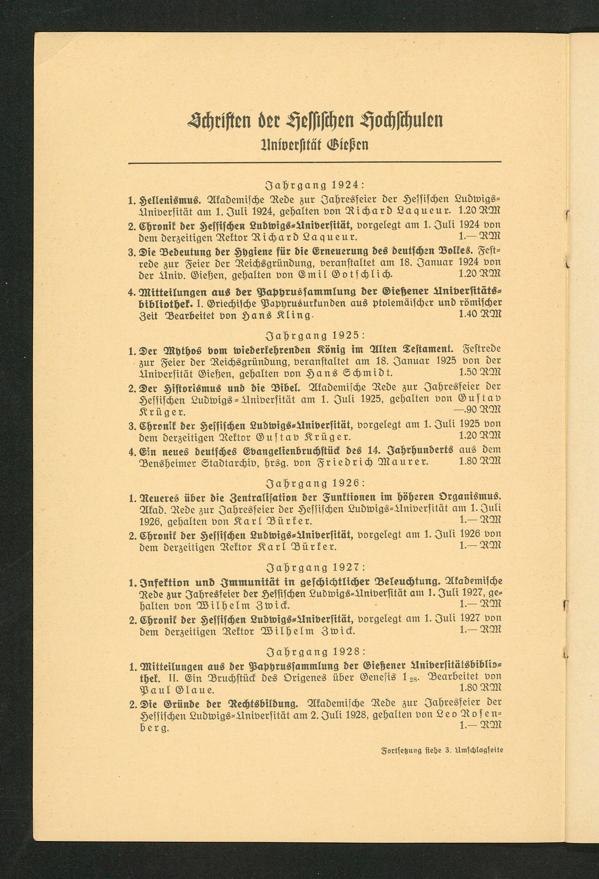 Jahrgang 1924: 1. Hellenismus. Akademische Rede zur Jahresfeier der Hessischen Ludwigs⸗ Aniversität am 1. Juli 1924, gehalten von Richard Laqueur. 1.20 RM 2. Chronik der Hessischen Ludwigs⸗Aniversität, vorgelegt am 1. Juli 1924 von dem derzeitigen Rektor Richard Laqueur. 1. RM 3. Die Bedeutung der Hygiene für die Erneuerung des deutschen Volkes. Fest⸗ rede zur Feier der Reichsgründung, veranstaltet am 18. Januar 1924 von der Univ. Gießen, gehalten von Emil Gotschlich. 1.20 RM
