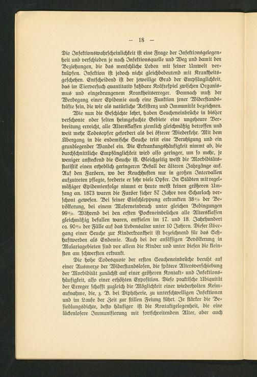 Wie nun die Geschichte lehrt, haben Seucheneinbrüche in bisher verschonte oder selten heimgesuchte Gebiete eine ungeheure Ver— breitung erreicht, alle Altersklassen ziemlich gleichmäßig betroffen und weit mehr Todesopfer gefordert als bei öfterer Wiederkehr. Mit dem Abergang in die endemische Seuche tritt eine Beruhigung und ein grundlegender Wandel ein. Die Erkrankungshäufigkeit nimmt ab, die durchschnittliche Empfänglichkeit wird also geringer, um so mehr, je weniger ansteckend die Seuche ist. Gleichzeitig weist die Morbiditäts⸗ statistik einen erheblich geringeren Befall der älteren Jahrgänge auf. Auf den Faröern, wo der Keuchhusten nur in großen Intervallen aufzutreten pflegte, forderte er sehr viele Opfer. In Städten mit regel⸗ mäßiger Epidemienfolge nimmt er heute meist keinen größeren Um⸗ fang an. 1873 waren die Faröer sicher 57 Jahre von Scharlach ver— schont gewesen. Bei seiner Einschleppung erkrankten 38 00 der Be⸗ völkerung, bei einem Maserneinbruch unter gleichen Bedingungen 99%. Während bei den ersten Pockeneinbrüchen alle Altersklassen gleichmäßig befallen waren, entfielen im 19. und 18. Jahrhundert ca. 90% der Fälle auf das Lebensalter unter 10 Jahren. Dieser Aber⸗ gang einer Seuche zur Kinderkrankheit ist bezeichnend für das Seß— haftwerden als Endemie. Auch bei der ansässigen Bevölkerung in Malariagebieten sind vor allem die Kinder und unter diesen die klein⸗ sten am schwersten erkrankt.