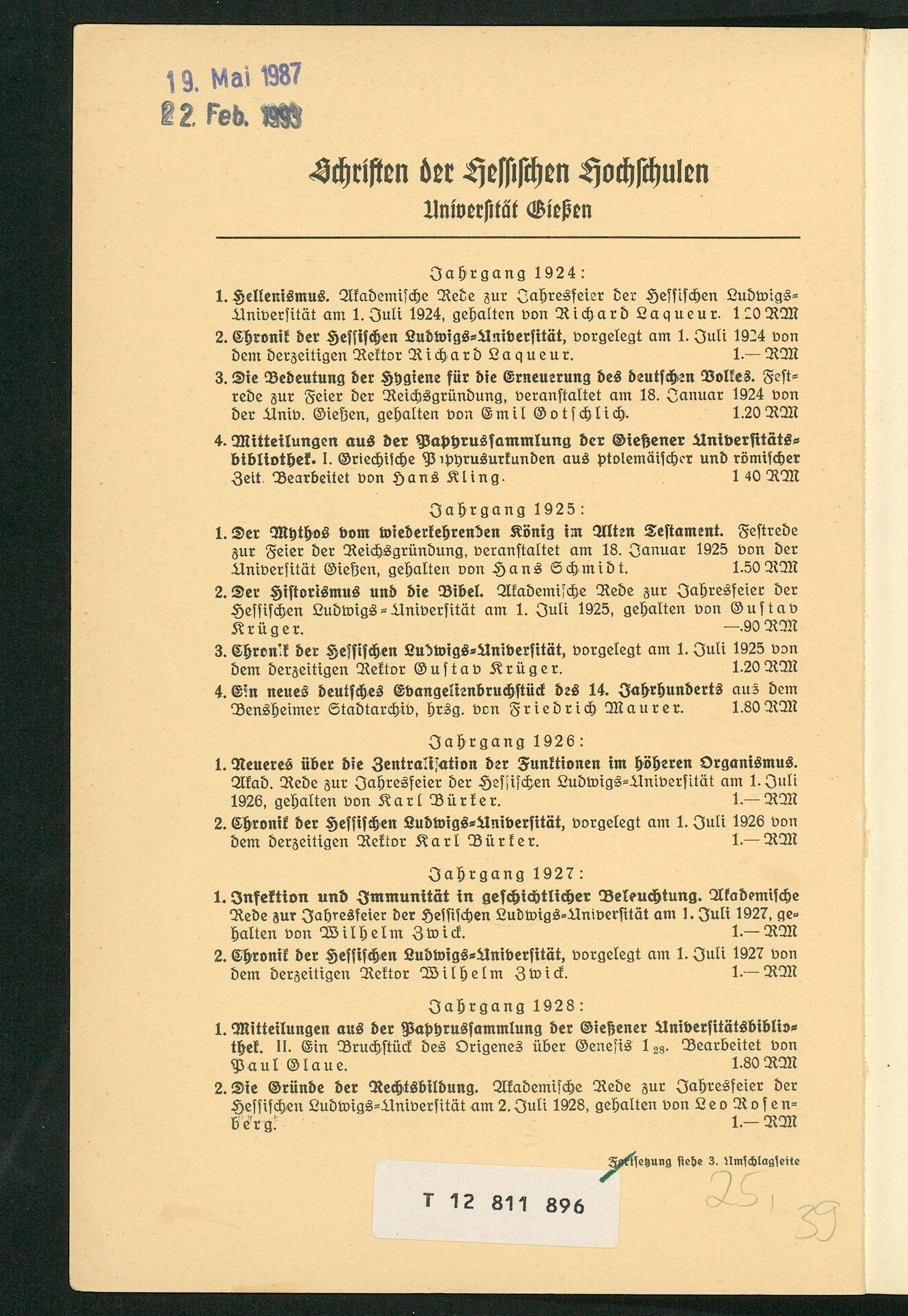 3. Chronik der Hessischen Ludwigs⸗Aniversität, vorgelegt am 1. Juli 1925 von dem derzeitigen Rektor Gustav Krüger. 1.20 RM