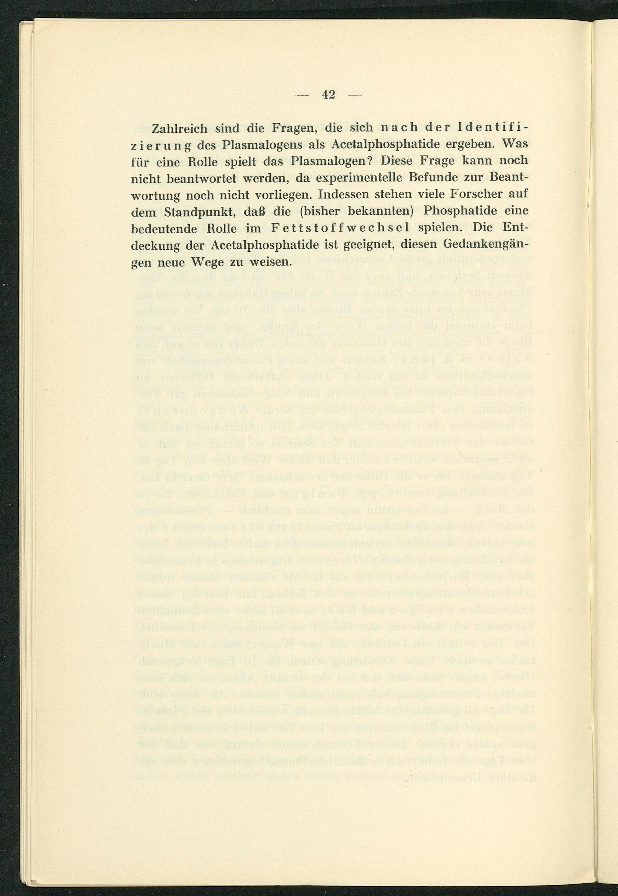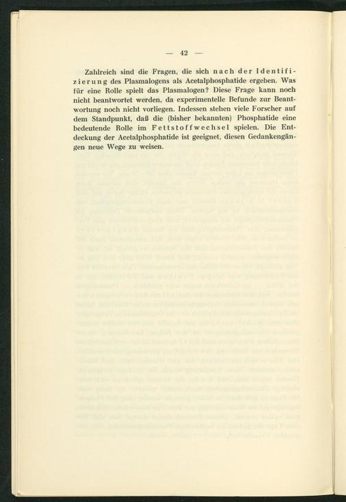 Zahlreich sind die Fragen, die sich nach der Identifi- zierung des Plasmalogens als Acetalphosphatide ergeben. Was für eine Rolle spielt das Plasmalogen? Diese Frage kann noch nicht beantwortet werden, da experimentelle Befunde zur Beant- wortung noch nicht vorliegen. Indessen stehen viele Forscher auf dem Standpunkt, daß die(bisher bekannten) Phosphatide eine bedeutende Rolle im Fettstoffwechsel spielen. Die Ent- deckung der Acetalphosphatide ist geeignet, diesen Gedankengän- gen neue Wege zu weisen.