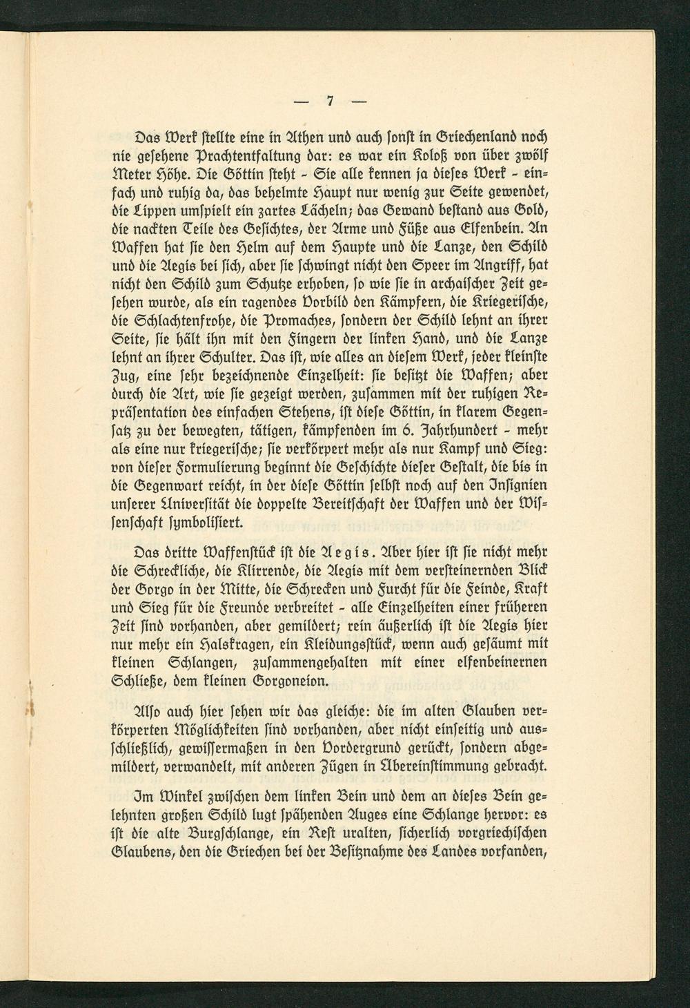 Das Werk stellte eine in Athen und auch sonst in Griechenland noch nie gesehene Prachtentfaltung dar: es war ein Koloß von über zwölf Meter Höhe. Die Göttin steht- Sie alle kennen ja dieses Werk- ein⸗ fach und ruhig da, das behelmte Haupt nur wenig zur Seite gewendet, die Lippen umspielt ein zartes Lächeln; das Gewand bestand aus Gold, die nackten Teile des Gesichtes, der Arme und Füße aus Elfenbein. An Waffen hat sie den Helm auf oͤem Haupte und die Lanze, den Schild und die Aegis bei sich, aber sie schwingt nicht den Speer im Angriff, hat nicht den Schild zum Schutze erhoben, so wie sie in archaischer Zeit ge⸗ sehen wuroͤe, als ein ragendes Vorbild den Kämpfern, die Kriegerische, die Schlachtenfrohe, die Promaches, sonoͤern der Schild lehnt an ihrer Seite, sie hält ihn mit den Fingern der linken Hand, und die Lanze lehnt an ihrer Schulter. Das ist, wie alles an oͤiesem Werk, jeder kleinste Zug, eine sehr bezeichnende Einzelheit: sie besitzt ie Waffen; aber durch die Art, wie sie gezeigt werden, zusammen mit oͤer ruhigen Re⸗ präsentation des einfachen Stehens, ist diese Göttin, in klarem Gegen⸗ satz zu der bewegten, tätigen, kämpfenden im 6. Jahrhundert- mehr als eine nur kriegerische; sie verkörpert mehr als nur Kampf und Sieg: von dieser Formulierung beginnt die Geschichte dieser Gestalt, die bis in die Gegenwart reicht, in der dͤiese Göttin selbst noch auf den Insignien unserer Aniversität die doppelte Bereitschaft ͤer Waffen und der Wis⸗ senschaft symbolisiert.