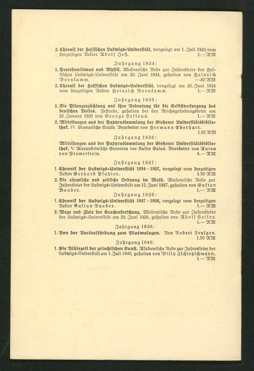 1. Chronik der Ludwigs⸗Aniversität 1937- 1938, vorgelegt vom derzeitigen Rektor Gustav Baader. 1. RM 2. Wege und Ziele der Seuchenforschung. Akademische Rede zur Jahresfeier der Ludwigs⸗Aniversität am 29. Juni 1988, gehalten von Adolf Seiser. 1. RM