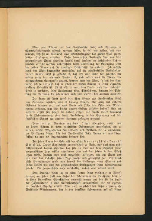 Die Frage ist somit zuerst die: Was könnte das Großdeutsche Reich von Osteuropa beziehen, was es bislang teilweise oder ganz aus anderen Gebieten bezogen hat, und was könnte als Folge der Osten von Mittel⸗ europa erhalten, was ihm bisher andere Gebiete geliefert haben? Und des weiteren ergibt sich sofort die andere Frage: wie könnte dieser Austausch durch Mehrerzeugung oder durch Umstellung in der Erzeugung auf den spezifischen Bedarf des anderen Partners gesteigert werden?