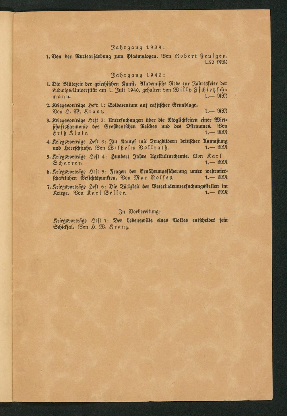 Fritz Klute. 1. RM 4. Kriegsvorträge Heft 3: Im Kampf mit Trugbildern britischer Anmaßung und Herrschsucht. Von Wilhelm Vollrath. 1. RM 8. Kriegsvorträge Heft 4: Hundert Jahre Agrikulturchemie. Von Karl Scharrer. 1. RM 6. Kriegsvorträge Heft 5: Fragen der Ernährungssicherung unter wehrwirt⸗ schaftlichen Gesichtspunkten. Von Max Rolfes. 1. RM 7. Kriegsvorträge Heft 6: Die Tä igkeit der Veterinäruntersuchungsstellen im Kriege. Von Karl Beller. 1. RM