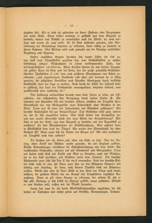 Unsere englischen Gegner sprechen sich damit selber ein Lob zu, das einst dem Themistokles gegolten hat, jene Geschicklichkeit zu rascher Erfindung nötiger Maßnahmen in jedem vorkommenden Falle, das gοτνοοντννοννντ⏑ιe» n. Allen Ernstes spielen sie mit diesem Zeugnis, als gehöre ihnen die Note und der Preis, den der große griechische Geschichts— schreiber Thukydides(I. 138) dem noch größeren Staatsmann von Athen zu⸗ erkannte:„mit angeborenem Verstande und ohne viel Lernens sei er fähig gewesen, bei plötzlichen Vorfällen nach kürzester Überlegung durch treffliche Entschlüsse Herr der Lage zu werden. Auch durch die Hülle der Zukunft habe er geschaut, den Lauf der Geschehnisse vorausgesehen, beizeiten erkannt, was zweckdienlich oder nachteilig sei.“