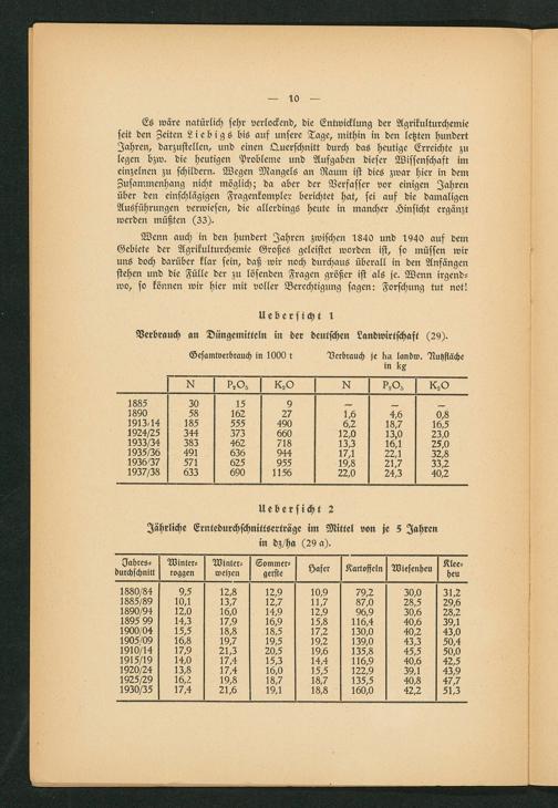 Es wäre natürlich sehr verlockend, die Entwicklung der Agrikulturchemie seit den Zeiten Liebigs bis auf unsere Tage, mithin in den letzten hundert Jahren, darzustellen, und einen Querschnitt durch das heutige Erreichte zu legen bzw. die heutigen Probleme und Aufgaben dieser Wissenschaft im einzelnen zu schildern. Wegen Mangels an Raum ist dies zwar hier in dem Zusammenhang nicht möglich; da aber der Verfasser vor einigen Jahren über den einschlägigen Fragenkompler berichtet hat, sei auf die damaligen Ausführungen verwiesen, die allerdings heute in mancher Hinsicht ergänzt werden müßten(33).