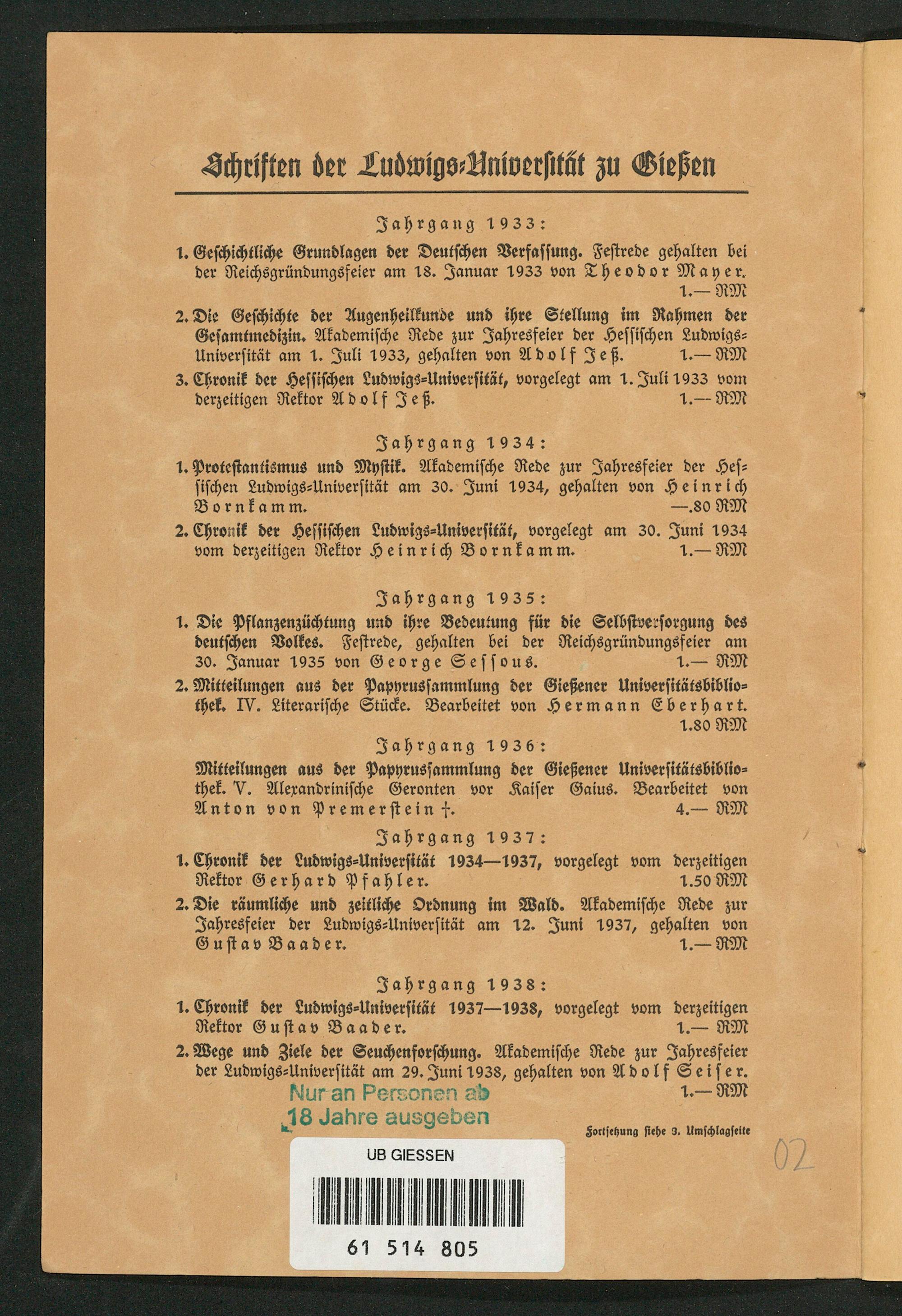 Jahrgang 1938: 1. Chronik der Ludwigs⸗Universität 1937— 1938, vorgelegt vom derzeitigen Rektor Gu stav Baader. 1. RM