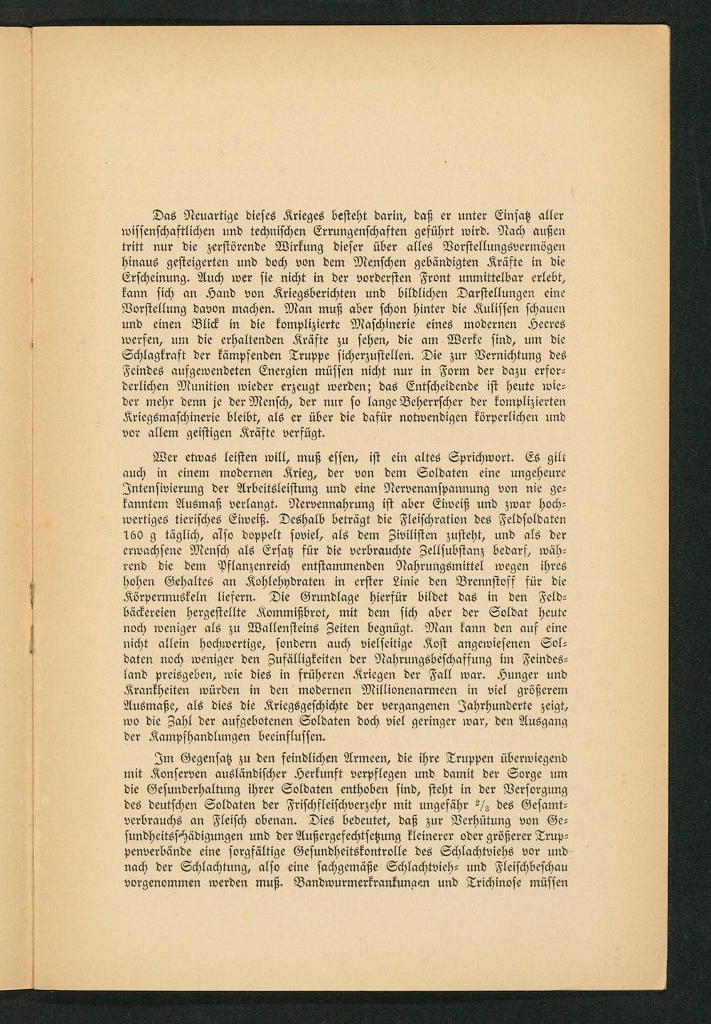 Im Gegensatz zu den feindlichen Armeen, die ihre Truppen überwiegend mit Konserven ausländischer Herkunft verpflegen und damit der Sorge um die Gesunderhaltung ihrer Soldaten enthoben sind, steht in der Versorgung des deutschen Soldaten der Frischfleischverzehr mit ungefähr/ des Gesamt— verbrauchs an Fleisch obenan. Dies bedeutet, daß zur Verhütung von Ge— sundheitsschädigungen und der Außergefechtsetzung kleinerer oder größerer Trup⸗ penverbände eine sorgfältige Gesundheitskontrolle des Schlachtviehs vor und nach der Schlachtung, also eine sachgemäße Schlachtvieh- und Fleischbeschau vorgenommen werden muß. Bandwurmerkrankungen und Trichinose müssen