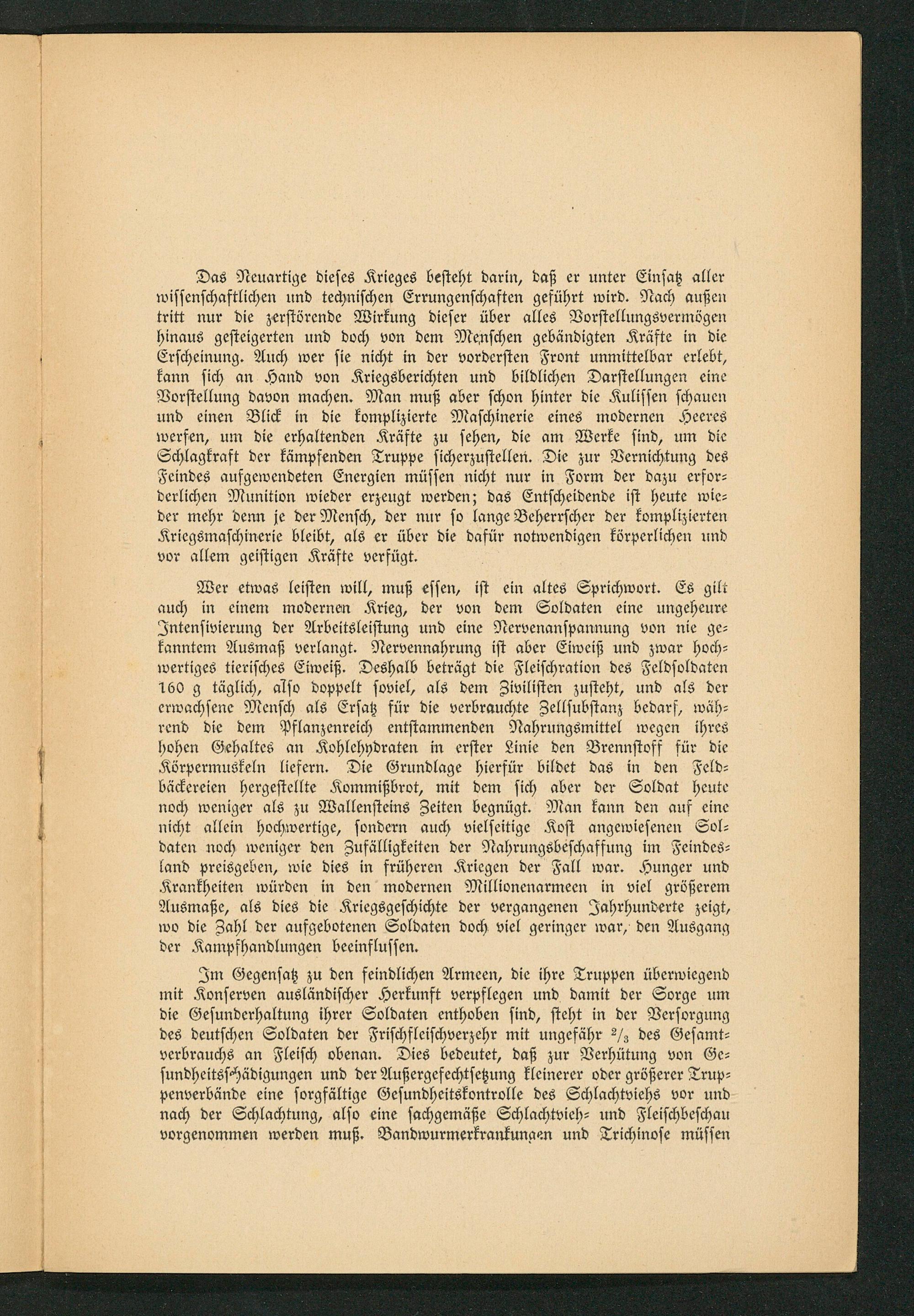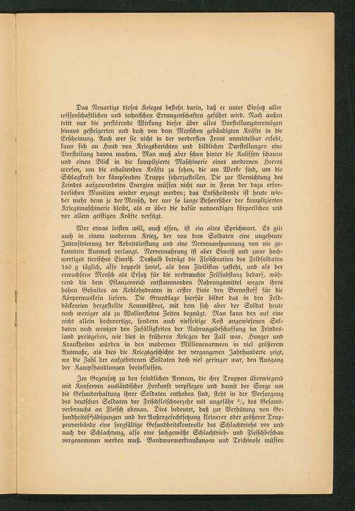 Wer etwas leisten will, muß essen, ist ein altes Sprichwort. Es gilt auch in einem modernen Krieg, der von dem Soldaten eine ungeheure Intensivierung der Arbeitsleistung und eine Nervenanspannung von nie ge— kanntem Ausmaß verlangt. Nervennahrung ist aber Eiweiß und zwar hoch— wertiges tierisches Eiweiß. Deshalb beträgt die Fleischration des Feldsoldaten 160 g täglich, also doppelt soviel, als dem Zivilisten zusteht, und als der erwachsene Mensch als Ersatz für die verbrauchte Zellsubstanz bedarf, wäh— rend die dem Pflanzenreich entstammenden Nahrungsmittel wegen ihres hohen Gehaltes an Kohlehydraten in erster Linie den Brennstoff für die Körpermuskeln liefern. Die Grundlage hierfür bildet das in den Feld— bäckereien hergestellte Kommißbrot, mit dem sich aber der Soldat heute noch weniger als zu Wallensteins Zeiten begnügt. Man kann den auf eine nicht allein hochwertige, sondern auch vielseitige Kost angewiesenen Sol— daten noch weniger den Zufälligkeiten der Nahrungsbeschaffung im Feindes— land preisgeben, wie dies in früheren Kriegen der Fall war. Hunger und Krankheiten würden in den modernen Millionenarmeen in viel größerem Ausmaße, als dies die Kriegsgeschichte der vergangenen Jahrhunderte zeigt, wo die Zahl der aufgebotenen Soldaten doch viel geringer war, den Ausgang der Kampfhandlungen beeinflussen.