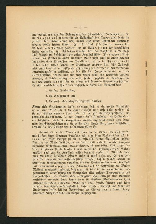 und wenden uns nun der Bekämpfung der(eigentlichen) Tierseuchen zu, die als Kriegstierseuchen für die Schlagkraft der Truppe auch heute im Zeitalter der Motorisierung noch immer eine unter Umständen ausschlag⸗ gebende Rolle spielen können. In erster Linie sind hier zu nennen der Malleus, auch Pferderotz genannt, und die Räude, die mit der menschlichen Krätze vergleichbar ist. Bei beiden Seuchen liegt der Nachdruck in der mög—⸗ lichst frühzeitigen Feststellung der ersten Krankheitsfälle. Die ungeheure Mas— sierung von Pferden in einem modernen Heere führt sonst zu einem derartig lawinenförmigen Anwachsen von Krankheiten, wie sie die Pferderäude in den beiden letzten Jahren des Weltkrieges erfahren hat. Ihr Nachweis wird heute durch die mikroskopische Feststellung der Erreger in den Veterinär— untersuchungsstellen gesichert, an die sich die Truppenveterinäre in allen Verdachtsfällen wenden und auf diese Weise nicht nur Sicherheit darüber erlangen, ob Räude vorliegt oder nicht, sondern zugleich die Grundlage für eine erfolgreiche und dabei für die Pferde doch schonende Behandlung schaffen. Es gibt nämlich beim Pferd drei verschiedene Arten von Räudemilben: