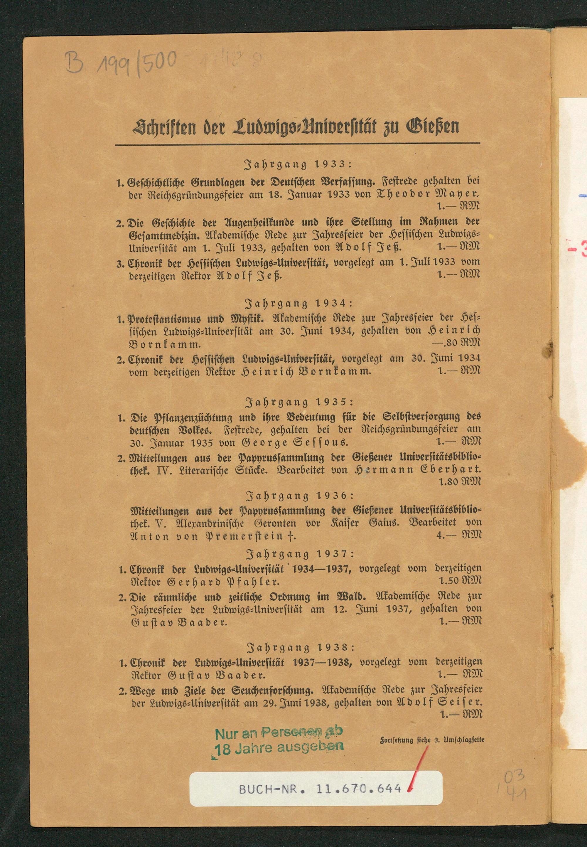 Bornkamm.. 80 RM 2. Chronik der Hessischen Ludwigs⸗Universität, vorgelegt am 30. Juni 1934 vom derzeitigen Rektor Heinrich Bornkamm. 1. RM