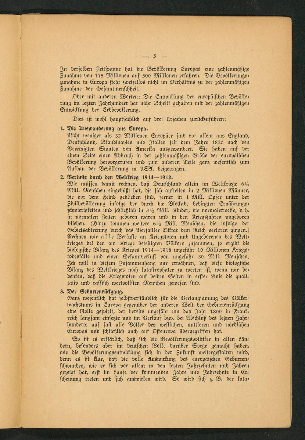 Wir müssen damit rechnen, daß Deutschland allein im Weltkriege 6½ Mill. Menschen eingebüßt hat, die sich aufteilen in 2 Millionen Männer, die vor dem Feind geblieben sind, ferner in 1 Mill. Opfer unter der Zivilbevölkerung infolge der durch die Blockade bedingten Ernährungs— schwierigkeiten und schließlich in 3½ Mill. Kinder, die normalerweise, d. h. in normalen Zeiten geboren wären und in den Kriegsjahren ungeboren blieben.(Hinzu kommen weitere 6½ Mill. Menschen, die infolge der