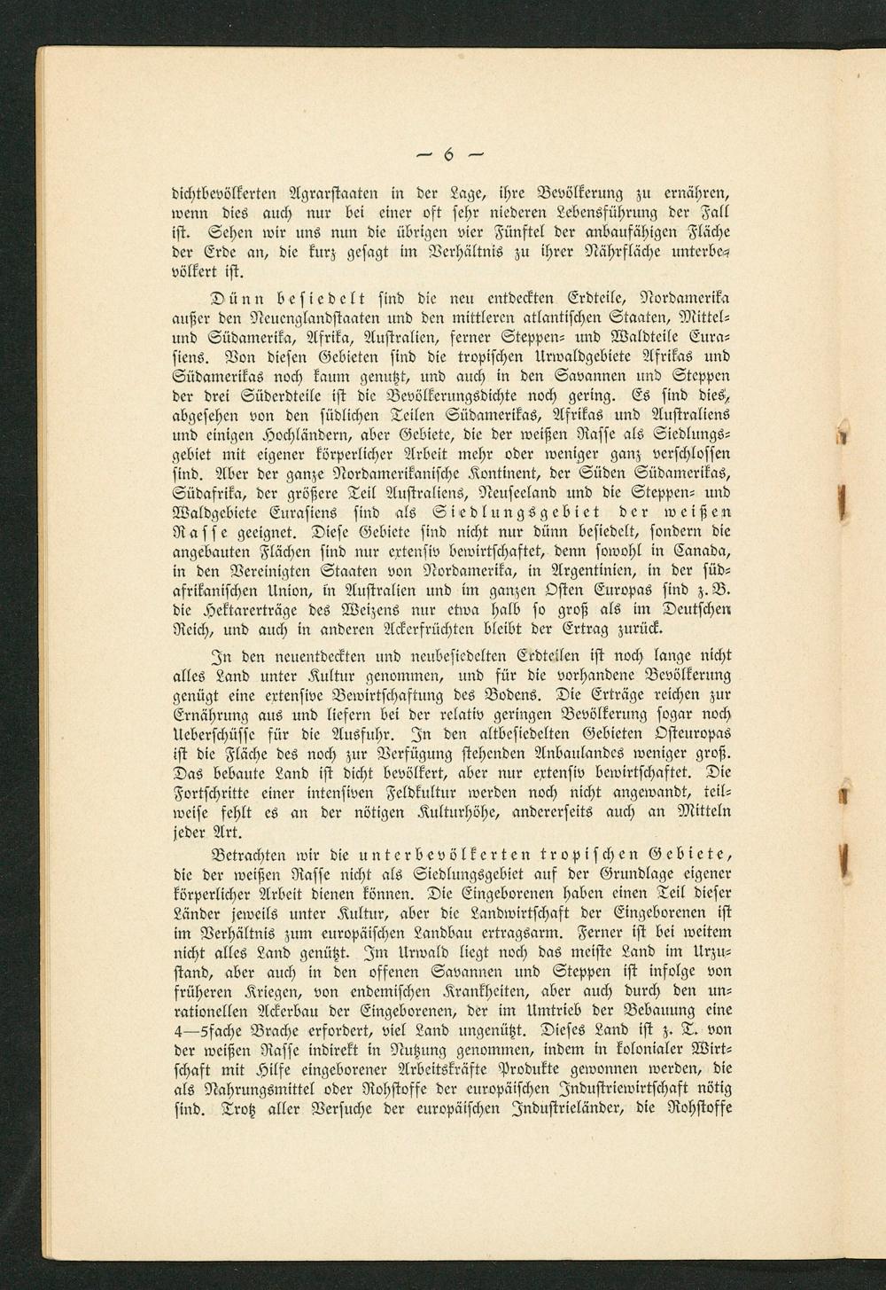 dichtbevölkerten Agrarstaaten in der Lage, ihre Bevölkerung zu ernähren, wenn dies auch nur bei einer oft sehr niederen Lebensführung der Fall ist. Sehen wir uns nun die übrigen vier Fünftel der anbaufähigen Fläche der Erde an, die kurz gesagt im Verhältnis zu ihrer Nährfläche unterbe—⸗ völkert ist.