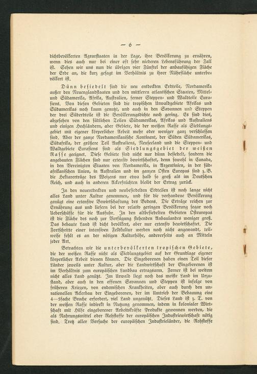 Dünn besiedelt sind die neu entdeckten Erdteile, Nordamerika außer den Neuenglandstaaten und den mittleren atlantischen Staaten, Mittel⸗ und Südamerika, Afrika, Australien, ferner Steppen⸗ und Waldteile Eura⸗ siens. Von diesen Gebieten sind die tropischen Urwaldgebiete Afrikas und Südamerikas noch kaum genutzt, und auch in den Savannen und Steppen der drei Süderdteile ist die Bevölkerungsdichte noch gering. Es sind dies, abgesehen von den südlichen Teilen Südamerikas, Afrikas und Australiens und einigen Hochländern, aber Gebiete, die der weißen Rasse als Siedlungs— gebiet mit eigener körperlicher Arbeit mehr oder weniger ganz verschlossen sind. Aber der ganze Nordamerikanische Kontinent, der Süden Südamerikas, Südafrika, der größere Teil Australiens, Neuseeland und die Steppen- und Waldgebiete Eurasiens sind als Siedlungsgebiet der weißen Rasse geeignet. Diese Gebiete sind nicht nur dünn besiedelt, sondern die angebauten Flächen sind nur extensiv bewirtschaftet, denn sowohl in Canada, in den Vereinigten Staaten von Nordamerika, in Argentinien, in der süd⸗ afrikanischen Union, in Australien und im ganzen Osten Europas sind z. B. die Hektarerträge des Weizens nur etwa halb so groß als im Deutschen Reich, und auch in anderen Ackerfrüchten bleibt der Ertrag zurück.