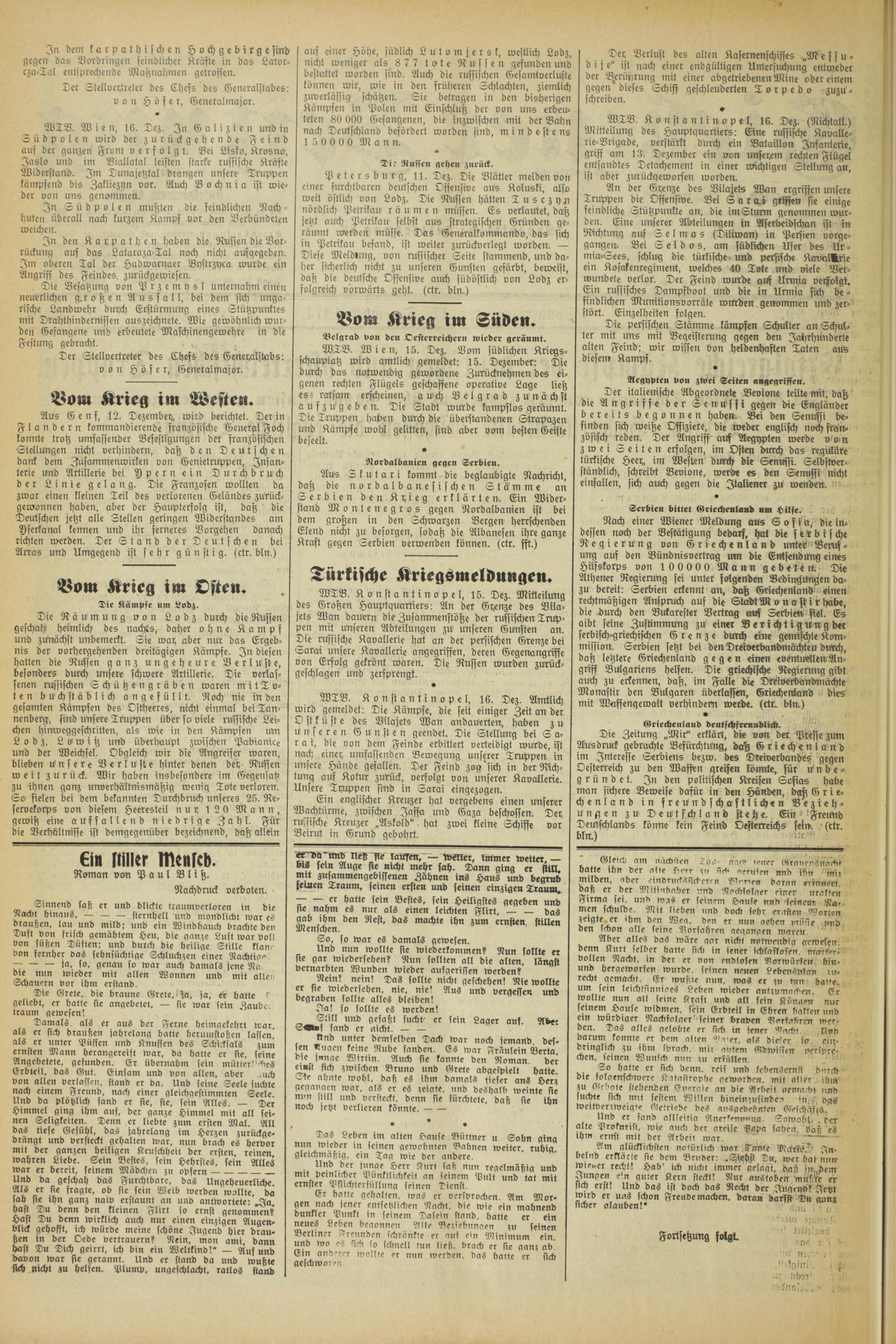 WTB. Wien, 16. Dez. In Galizien und in Südpolcn wird der zurückgehende Feind auf der ganzen Front verfolgt. Bei Lisko, Krosno, Iaslo und im Biallatal leisten starke russische Kräfte Widerstand. Im Dunajctztal drangen unsere Truppen kämpfend bis Zaktiezyn vor. Auch B o ch n i a ist wieder von uns genommen.