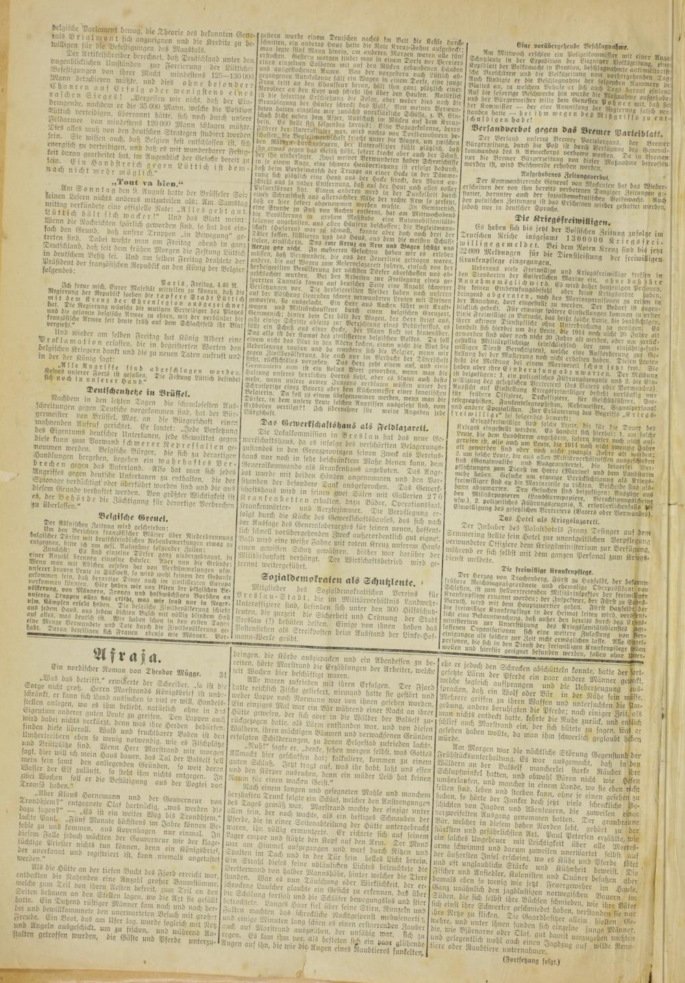 Um den Berichten sranzösischcr Blätter über Riederbrennnng belgischer Dörfer mit dcutschscinblicheu Ncbetibcmcrkungc» etwas zu entgegnen, bitte ich um gell. Ausnahme folgender Zeilen:
