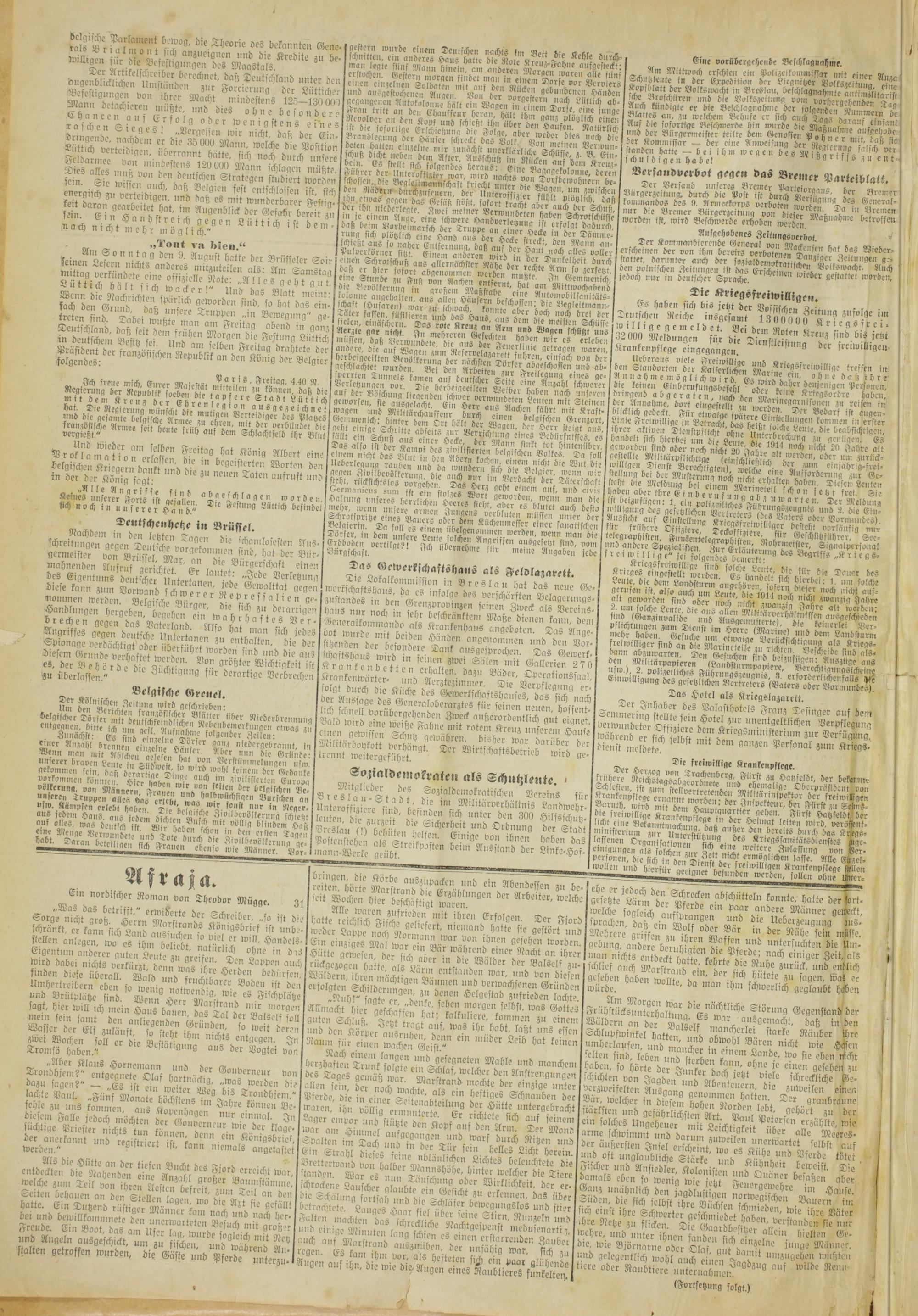 Nachdem in den letzten Tagen die schamlosesten Ausschreitungen gegen Deutsche vorgekoninien sind, hat der Bür- germeister von Brüssel, Mar, an die Bürgerschaft einen mahnenden Aufruf gerichtet. Er lautet: „Jede Verletzung des Eigentums deutscher Untertanen, jede Gewalttat gegen diese kann zum Vorwand schwerer Repressalien genommen werden. Belgische Bürger, die sich zu derartigen Handlungen hcrgeben, begehen ein wahrhaftes Verbrechen gegen das Vaterland. Also hat man sich jedes Angriffes gegen deutsche Untertanen zu enthalten, die der Spionage verdächtigt'oder überführt worden sind nnb die aus diesem Grunde verhaftet werden. Von größter Wichtigkeit ist cs, der Behörde die Züchtigung für derartige Verbrechen >zu überlassen."