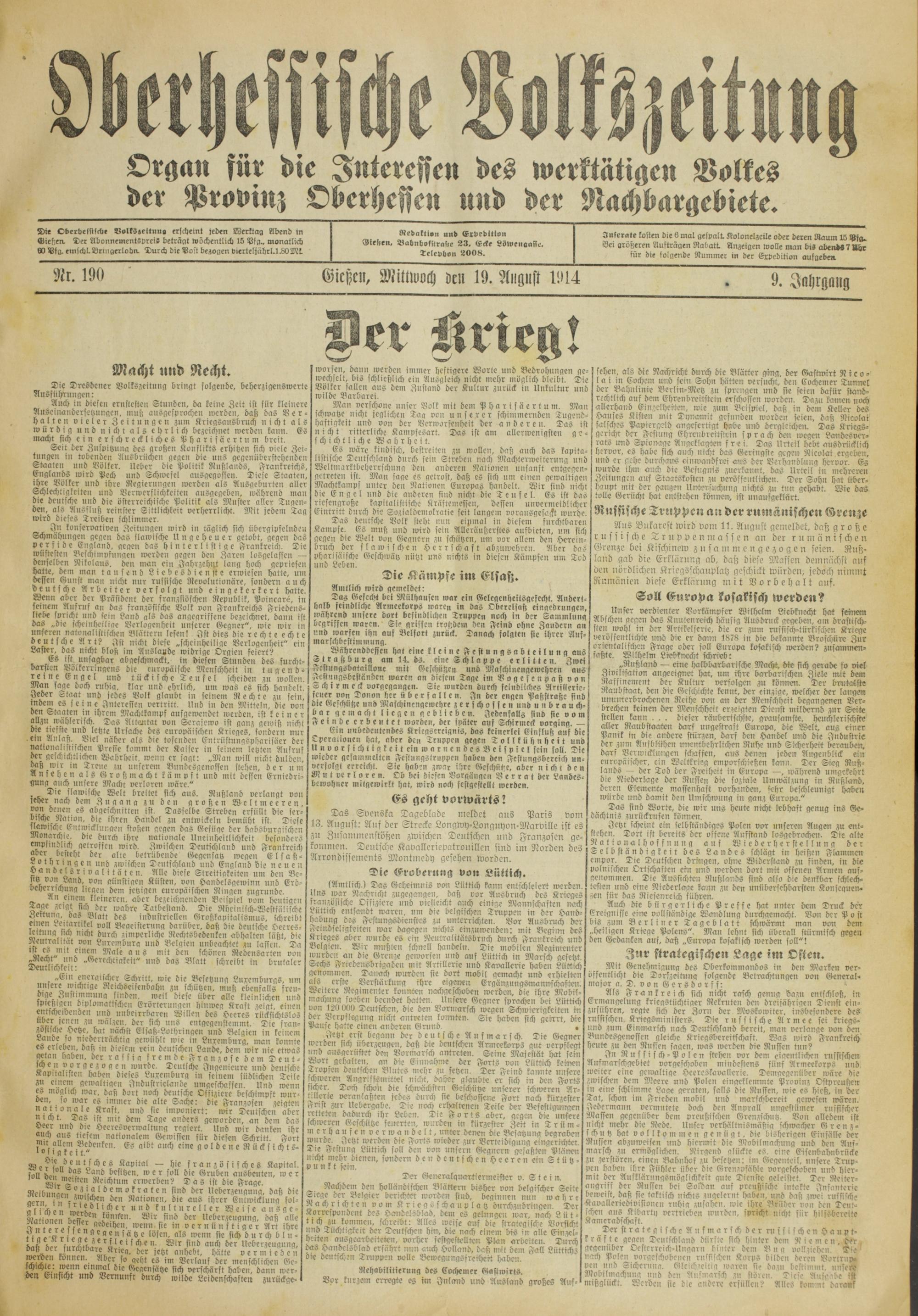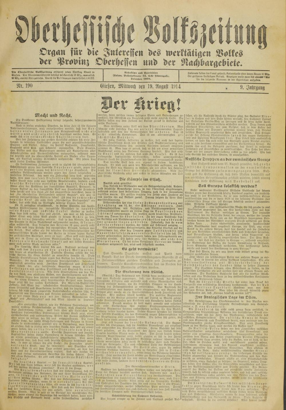 Auch in diesen ernstesten Stunden, da keine Zeit ist sür kleinere Auseinandersetzungen, muss ausgesprochen werden, dass das Verhalten vieler Zeitungen zum Kriegsausbruch nicht als würdig und nicht als ehrlich bezeichnet werden kann. Es macht sich ein erschreckliches Pharisäertum breit.