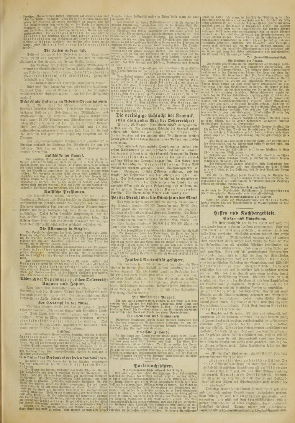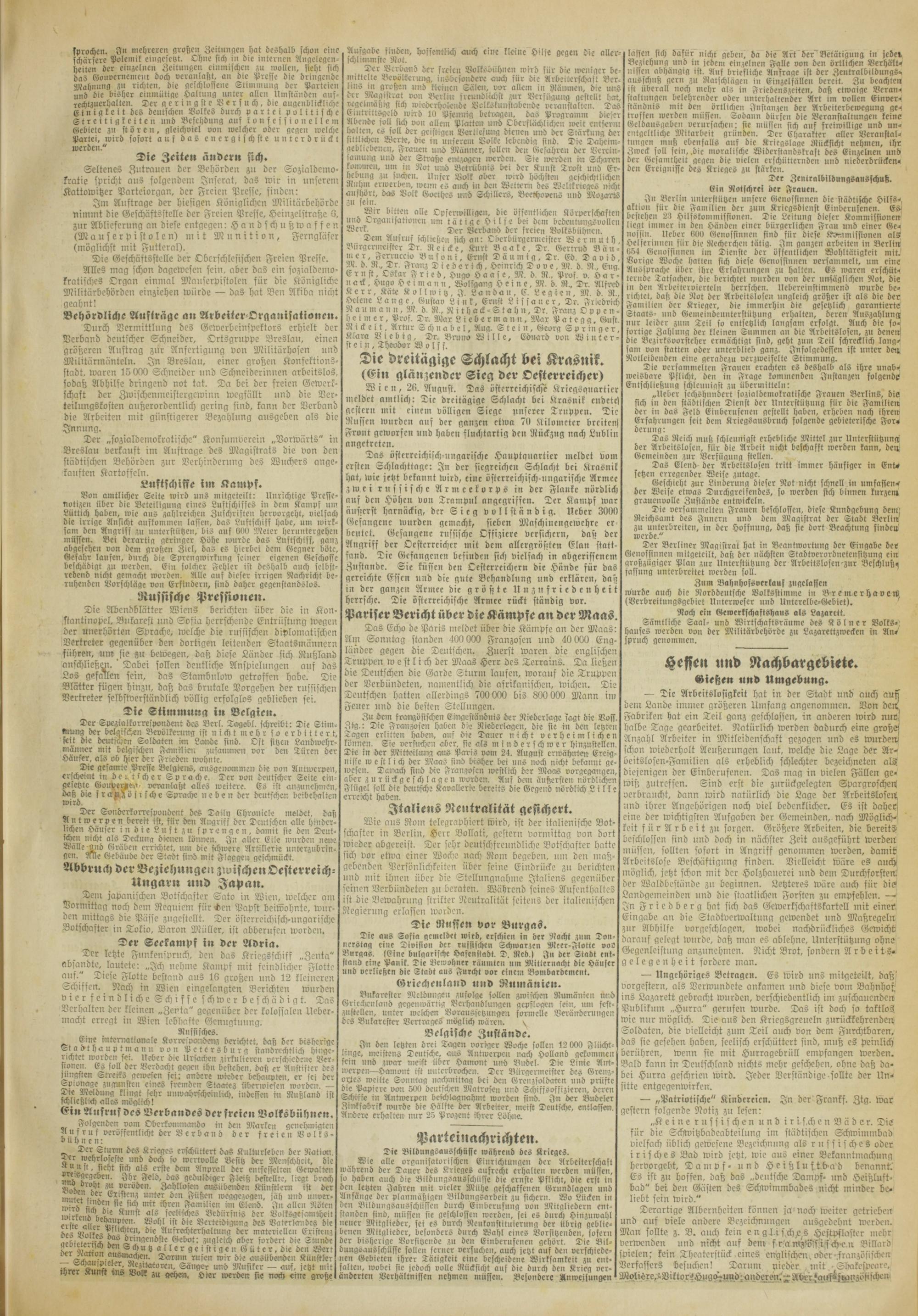 Das österreichisch-ungarische Hauptquartier meldet vom ersten Schlachttage: In der siegreichen Schlacht bei Krasnik hat, wie jetzt bekannt wird, eine österrcichisch-nngarische Armee zwei russische Armeekorps in der Flanke nördlich ans den Höhen von Tramp»! angegriffen. Ter Kampf war äußerst harnäckig, der Sieg vollständig, lieber 3000 Gefangene wurden gemacht, sieben Maschinengewchrc er beutet. Gefangene russische Lssizicre versichern, daß der Angriff der Ocstcrreichcr mit dem allergrößten Elan stattfand. Tic Gefangenen befinden sich vielfach in abgerissenem Zustande. Sie küssen den Oestcrrcichcrn die Hände für das gereichte Essen nnd die gute Behandlung und erklären, daß in der ganzen Armee die größte Unzufriedenheit herrsche. Tie österreichische Armee rückt ständig vor.