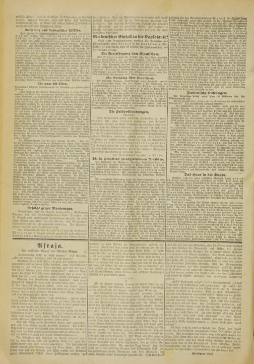 Nach einer Rcntermeldung machten die Deutschen ans Südwestafrika einen E i n s a l l in die Kapkolonie. Ihre Stärke sei unbekannt, doch sei bereits ein Zusammenstoß mit Afrikandern erfolgt.